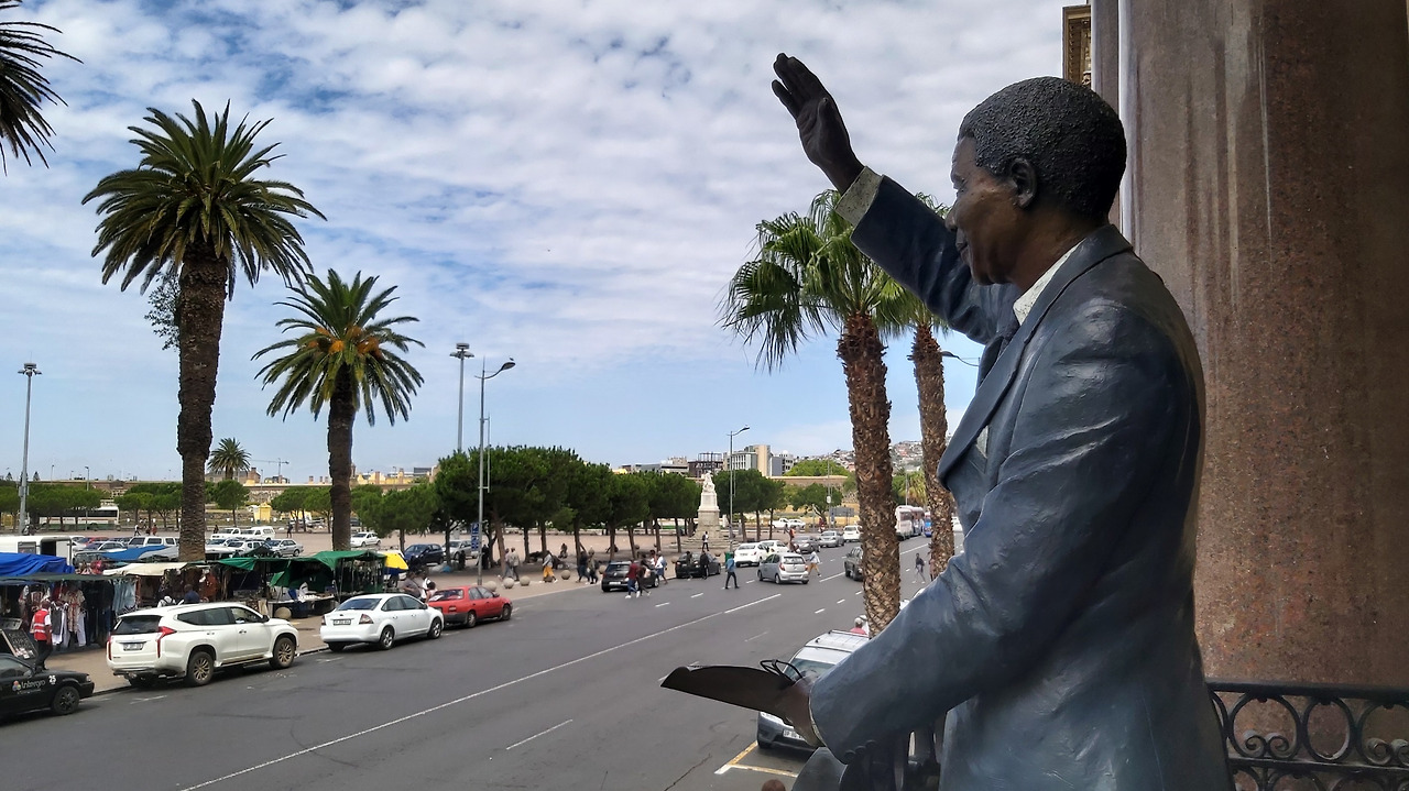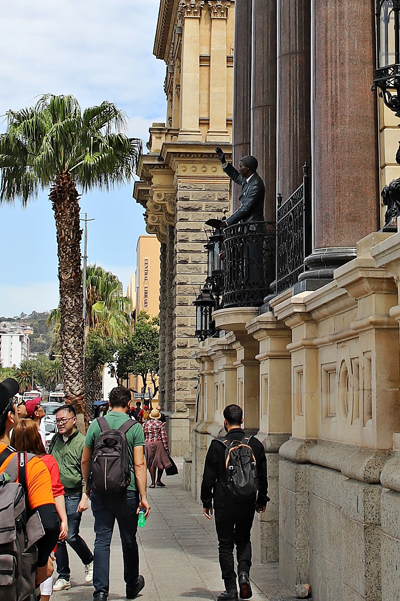 생각지도 못한 곳에서 우리가 사전에 알지 못했던 동상을 이곳에서 만날 줄이야. 역시 걸으며 만나는 여행의 묘미가 이것이 아닌가 싶었다. 이층 난간에서 손을 들어 아래를 향해 미소 짓는 만델라의 동상이 있는 이 건물은 케이프타운 시청 건물이었다. 건물 아래서 위의 동상을 향해 사진을 찍으며 소란(?)을 피우는 우리 일행을 보고, 시청 청원경찰쯤으로 보이는 사람이 내부로 들어와서 구경해도 된다고 안내를 해주었다. 이건 또 무슨 행운이람? "땡큐"를 연신 외치며 안내에 따라 계단을 통해 이층으로 올라갔다. 이층에 올라 보니 만델라는 시청 앞 광장을 향해 손을 내밀어 그 앞에서 일상을 살아가는 사람들에게 위로와 격려를 하는 듯한 모습으로 보였다. 동상이 거대하지도 않았고 그저 원래 만델라의 체형 정도로 만들어 그의 정신을 왜곡하지 않는 듯한 느낌이었다. 1990년 넬슨 만델라가 로빈아일랜드에서 오랜 징역 생활 끝에 석방되어 나와 이곳 시청사 발코니에서 처음으로 공개 연설을 했다고 하는데 딱 그 자리에 딱 그 모습으로 동상을 만들어 놓은 것이 아닌가 싶었다. 시청사 발코니에서 연설한 곳으로도 유명합니다.