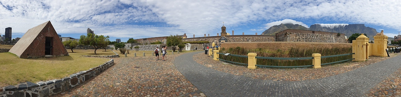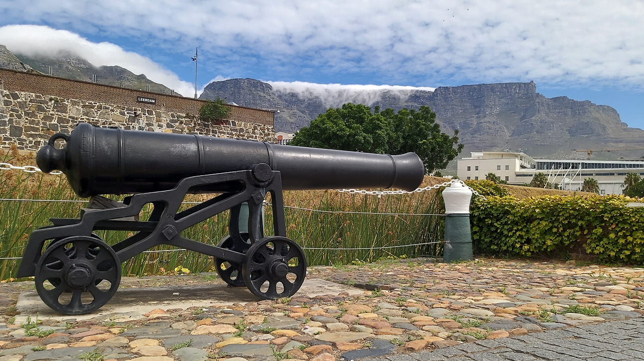 성 입구 주변을 둘러보다 보니 오랜 식민 역사, 침략의 역사 속에서 그 중심을 차지하고 있던 성이라고 하기에는 주변 풍광과 성은 절묘하게 어울리는 듯한 느낌을 받았다. 성의 뒤로 보이는 테이블마운틴의 높고 평평한 산세는 마치 또 하나의 성벽처럼 굳건히 이 성과 케이프타운을 지키는 듯한 느낌을 주었다. 어쩌면 그 옛날 이곳을 탐하던 유럽인들의 길잡이였던 저 산과 유사한 모습으로 성을 지은 것이 아닌가 하는 착각이 들 만큼이었다. 오히려 지금은 파아란 하늘과 하이얀 구름의 조화에 하나의 아름답고 훌륭한 풍광을 자랑하는 듯하여 무언가 아이러니한 느낌마저 들었다. 눈을 돌리며 찬찬히 둘러보다가 만난 거대한 옛날 식 포 하나가 이곳이 군사지역이었음을 불현듯 일깨워주었다.