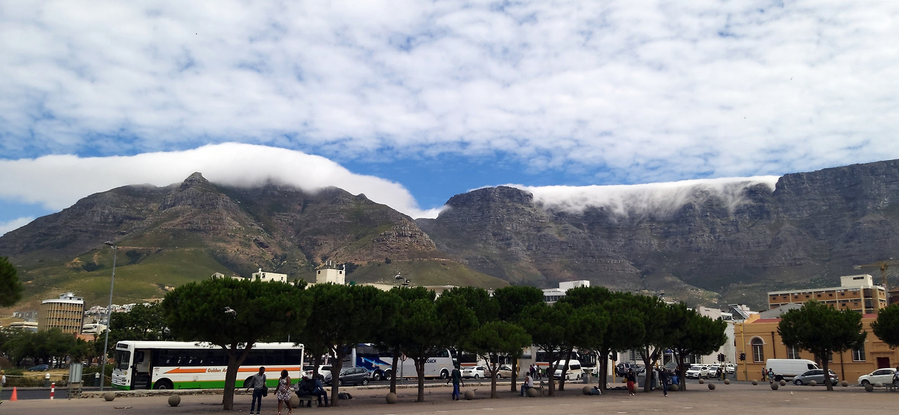 광장에서 바라본 테이블마운틴. 아침보다는 많이 걷혔지만 여전히 솜털같은 식탁보가 평평한 정상부근에서 흘러내리고 있다.