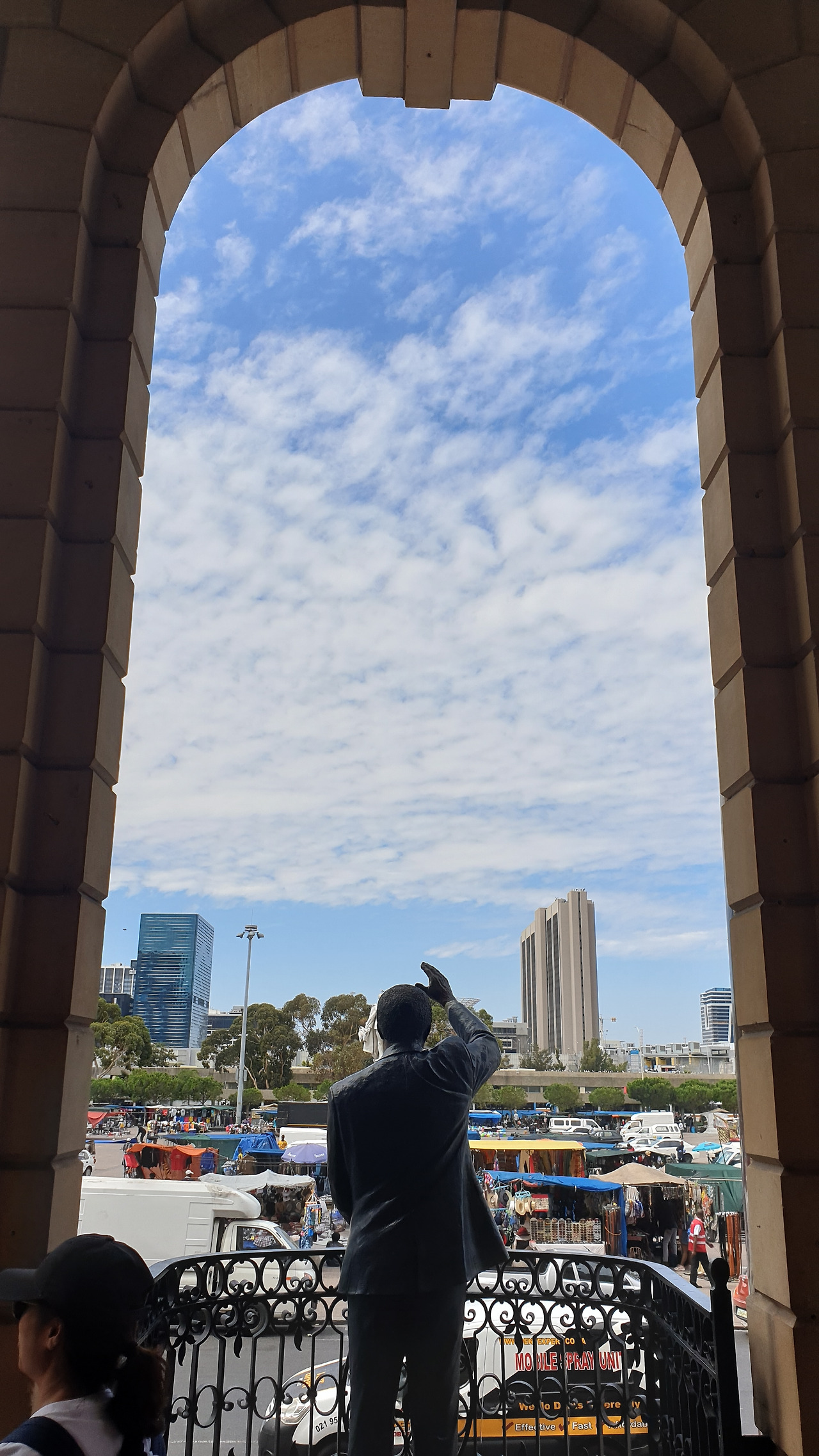 그와 함께 우리 일행들도 사진을 남겨보기로 했다. 만델라의 손짓을 따라하기도 하고 그에게 안겨보기도 하면서 즐겁게 사진을 찍고 내려왔다. 그리고 바로 만델라의 그 눈빛과 손짓이 닿는 그 광장으로 가보았다. 사실 광장이라고 하기보다는 주차장이라고 하는 편이 나을 듯했다. 주차구획선이 많이 그려져 있었고 일부 주차된 차들도 있었다. 인도와 가까운 광장 가장자리로는 각종 노점상들이 천막을 쳐놓고 여러 가지 잡화를 팔고 있었다. 대부분 흑인들이었다. 어제부터 느낀 사실이지만 인종차별의 문제가 해결되었다고 하기에는 아직도 개선되어야 할 점들이 곳곳에서 보였다.