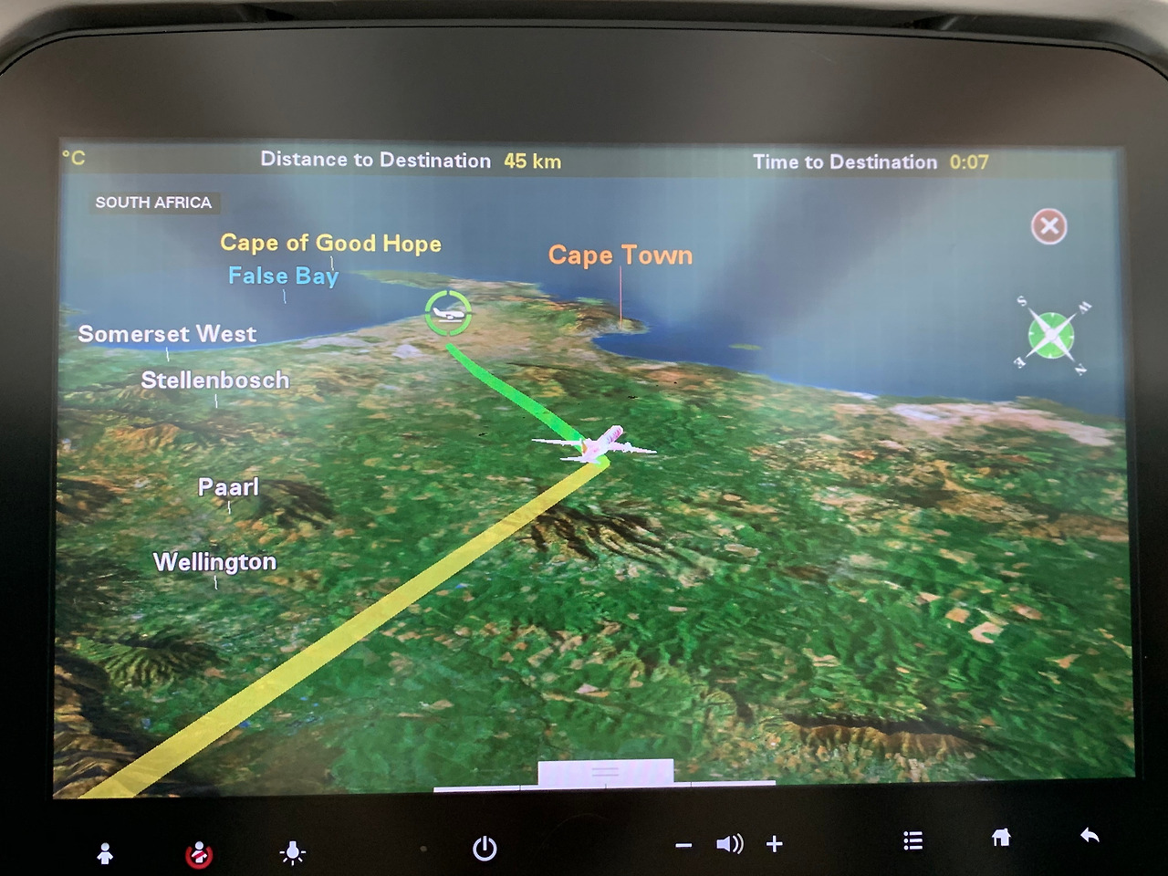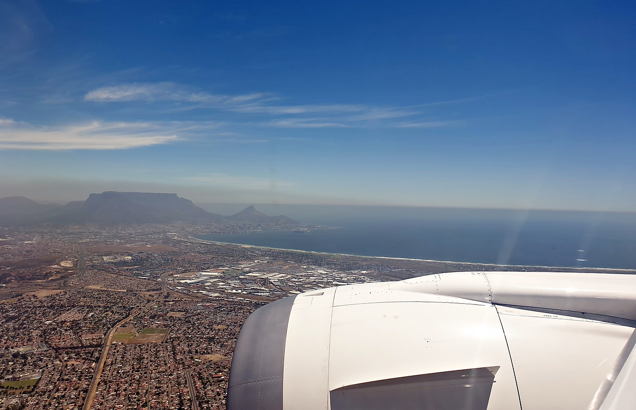 몇 시간이 지나 잠을 깼고 그와 동시에 눈은 좌석 앞 모니터의 화면으로 향했다. 지도의 그래픽이 점점 케이프타운에 가까워지고 있었다. 창 밖을 보니 서서히 지구의 표면에 있는 지형지물들이 하나씩 인식될 만큼 거리가 가까워져 갔다. 먼 옛날 뱃사람들이 아프리카의 최남단을 지나며 케이프타운에 있는 테이블마운틴을 보며 대서양과 인도양의 기준점을 지나는 것으로 인식했던 것처럼 비행기에서도 그 테이블마운틴을 눈으로 인식하게 되면서 남아프리카공화국에 다다랐음을 알게 되었다.