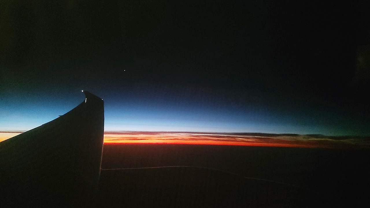 어느 순간 불현듯 잠에서 깼다. 시간은 11:10(한국시간). 11시간의 비행 끝에 창 밖으로 서서히 동이 터오기 하고 있었다. 비행기가 밤의 시간을 아무리 부지런히 달려도 지구의 속도보다 빠를 수는 없는 건가 보다 하는 생각이 들었다. 또다시 나오는 기내식을 먹고 창밖의 풍경을 감상하고 있었다. 세계 어느 곳이든 일출의 장면을 본다는 것은 경이로운 일이다. 더욱이 그것을 하늘 위에서 본다는 것은 지상의 모든 것을 덮은 구름 위에서 마치 내가 우주의 작은 존재임을 확인시켜주는 듯한 느낌을 주었다. 구름 위에서 색의 스펙트럼을 펼쳐내는 자연의 모습이 무척 아름다웠다.