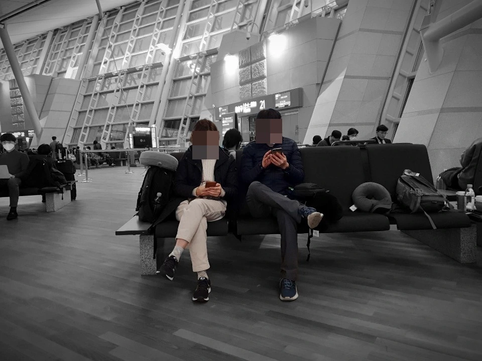 그 와중에 열혈님이 스타벅스를 물어물어 찾아가서 커피를 우리 일행 숫자만큼 사 왔다. 역시 열혈님은 배포가 크다. 그 커피는 유쾌님이 사 오신 블루베리 머핀이랑 궁합이 딱 맞았다. 21번 게이트 앞에서 출발 시각을 기다리며 간식으로 먹기에 딱이었다. 간식을 즐기며 휴대폰 사진의 여러 기능들을 발견하고 시험하며 시간을 보냈다. 라이브포커스 기능을 익혀 배경을 흐릿하게 날려 인물이 도드라지고 예쁘게 나오게도 해보고, 배경을 흑백으로 처리하고 원하는 부분만 컬러로 나오게도 해보며 고수님들의 스킬을 하수님들에게 전수했다. 하수들은 이런 기능들을 왜 이제야 알았을까 탄식하며 여러 번 사진찍기 놀이를 하며 시간을 보냈다. 감독님은 촬영 감독님답게 짐벌을 꺼내 휴대폰과 연결하고 영상 촬영을 한창 시험해보기도 했다. 한참을 그렇게 휴대폰 사진 찍기 놀이를 하고 있으니 비행기 탑승 시작 안내가 나왔다.