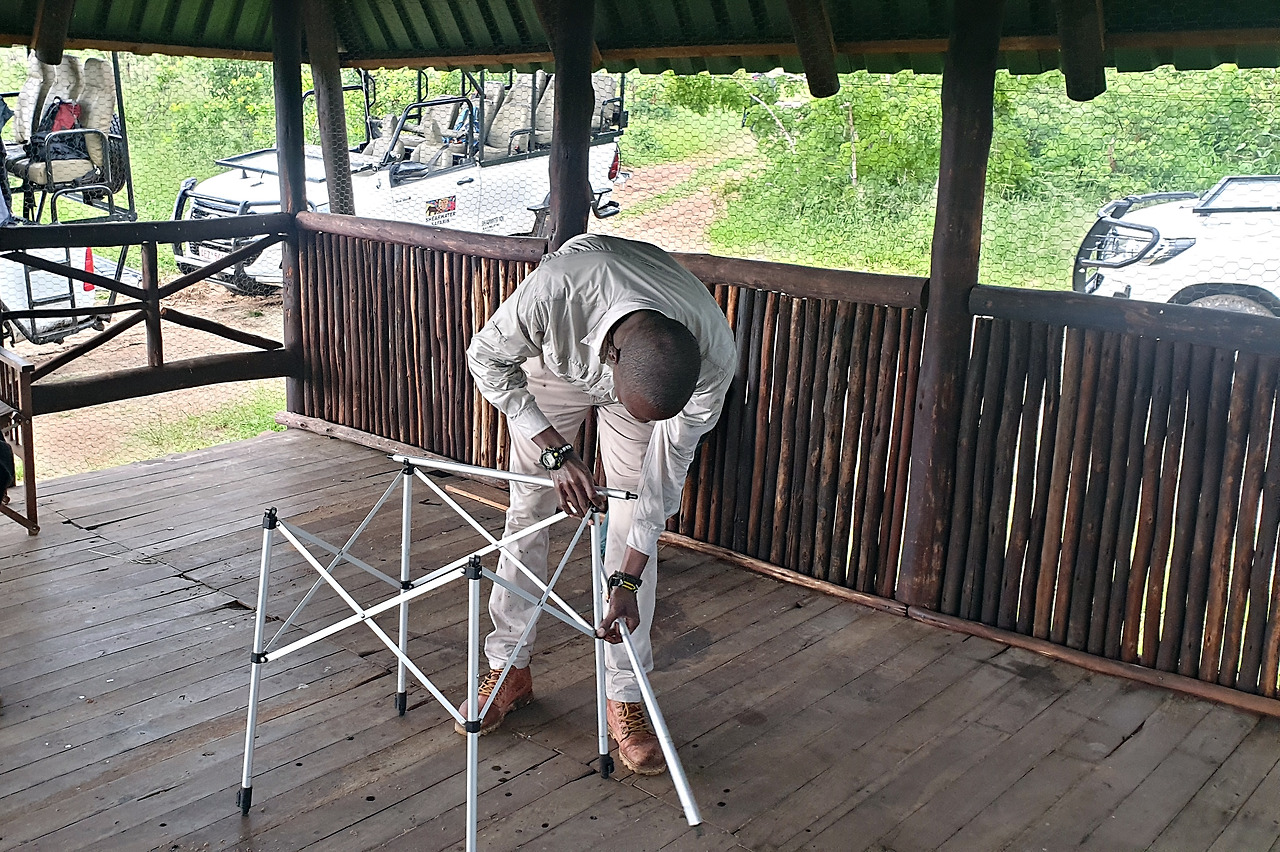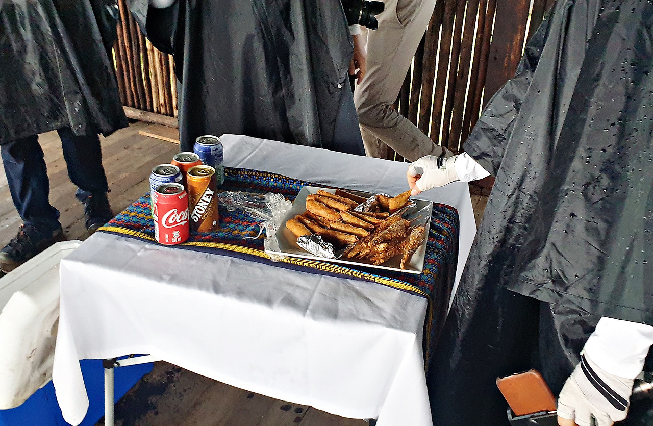 어렵사리 난관을 극복한 프린스는 차량이 지나다니며 만들어낸 흙길을 따라 조심스레 운전을 계속했고 어느 조그만 오두막으로 우리를 안내했다. 그리고 모두 내려 오두막으로 올라가게 했다. 비를 피할 수 있는 장소였다. 그런데 이게 단순히 비를 피하기 위한 오두막은 아니었던 모양이었다. 일행들을 안내한 뒤 프린스는 어디선가 캠핑용 테이블을 가져와 조립하더니 거기에 하얀 식탁보와 아프리카 분위기가 나는 테이블 러너까지 덮어 그럴듯한 테이블을 뚝딱 만들어냈다. 그러더니 또 어디선가 음료(맥주 포함 ㅋㅋ)와 치킨 등 간식거리를 가져와 펼쳐 놓았다. 아직 따뜻한 치킨과 튀김은 비에 젖어 오돌오돌 떨기 시작한 우리에게 온기를 퍼뜨려주기에 충분했다.