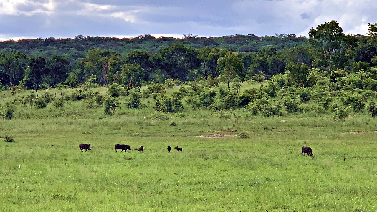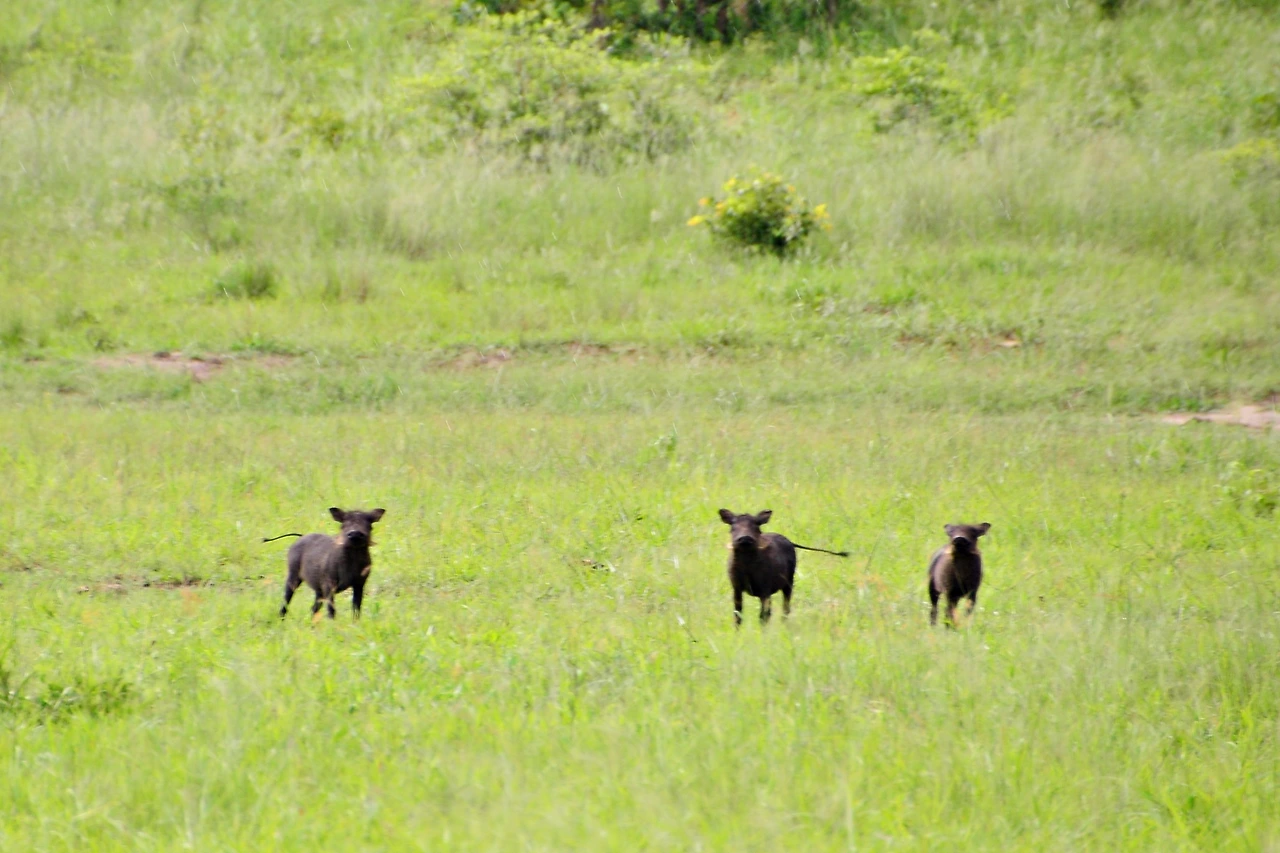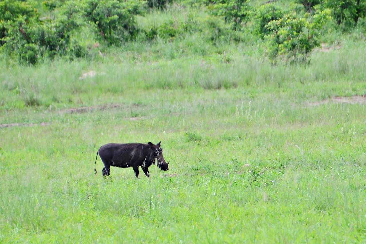 우리는 프린스의 배려로 실컷 사진을 찍고 나서야 다시 이동을 시작했다. 양 옆으로 키 큰 나무들의 숲이 이어지고 그 가운데로 난 초원을 따라 차량은 이동했다. 얼마 지나자 다시 프린스가 "저기를 보세요~!" 했다. 이번에는 코뿔소.... 인 줄 알았다. 그런데 코뿔소라고 하긴 너무 왜소했다. 그냥 멧돼지 정도가 어울리는 사이즈였다.(나중에 찾아보니 아프리카 초원지대에서 자주 발견되는 혹멧돼지라고 하는 녀석이었다.) 그 녀석 한 마리가 푸른 풀 숲에서 검은색 존재감을 드러내더니 어느 순간 풀숲 사이에서 아주 작은 녀석들이 뿅 하고 나타났다. 새끼들이었다. 그렇게 한 가족이 우리에게 모습을 드러낸 것이었다. 부모로 보이는 녀석이 먼저 나타나 우리들의 동태를 살피더니 우리가 시동을 끄고 조용히 있으니 가족 모두가 안심하고 나타난 것으로 보였다. 이들의 단란한 오후를 우리가 방해하는 건 아닐까 하는 생각이 불현듯 들었다.
