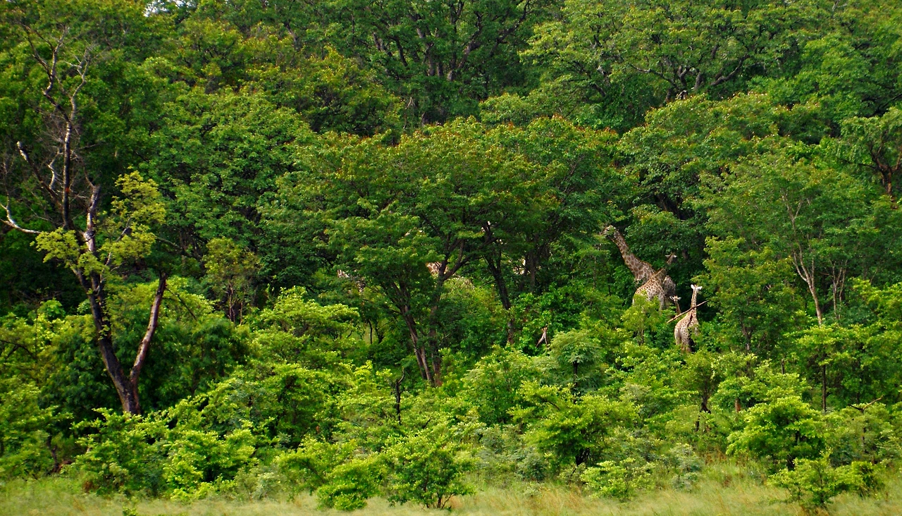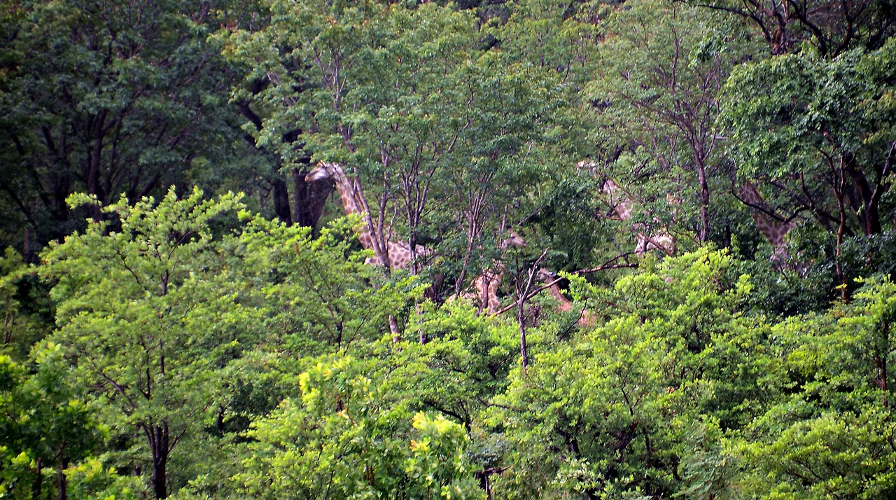 프린스는 기린이 있다는 것이었다. 그런데 잘 보이지가 않았다. 너무 멀었다. 숨은그림찾기 수준이었다. 눈썰미 좋은 누군가가 "있다, 기린~!"을 외쳤다. 프린스의 손가락이 가리키는 그 끝에 기린 여러 마리가 나무 사이사이에 숨어 있는 것이 보였다. 워낙 조심성이 많은 녀석들이라 가까이 가면 다 숲으로 들어가 버릴 것이고 녀석들도 우리의 동태를 살피는지 그 숲에서 자신들의 몸을 숨기고 나뭇잎을 뜯어먹고 있었다. 두 눈을 부릅뜨고 자세히 살펴보니 한 가족으로 보였다. 아직 어린 새끼들이 부모와 함께 있었다. DSLR 카메라의 줌을 최대한 당겨서 사진을 찍기 시작했다. 그래도 멀긴 멀었다. 그런데 자세히 살펴보니 기린 가족 하나만 있는 것이 아니었다. 앞 뒤로 나무 뒤에 숨어 조심스럽게 먹이활동을 하는 다른 기린 가족도 보였다. 너무 멀기도 하고 나무 숲 사이에 자신들의 몸을 숨기는 조심성 때문에 우리 눈으로 확인하기가 쉽지는 않았다. 야생의 기린을 만나는 것이 이렇게나 어려운 일인가 싶었다.