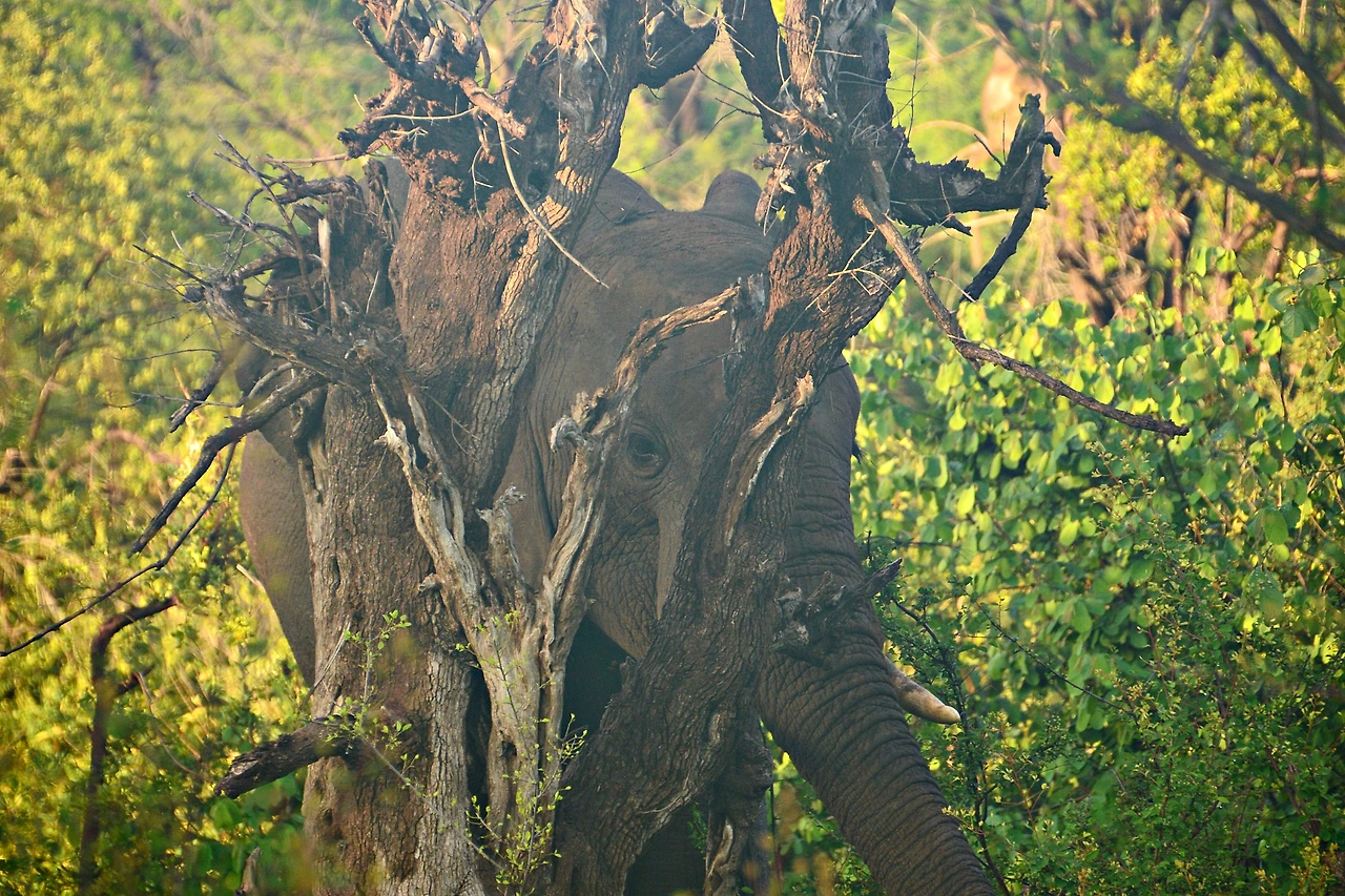 프린스의 차는 이제 게임 드라이브의 입구까지 얼마 남지 않은 곳까지 다다랐다. 작은 나무숲이 이어지고 있었고 이곳을 다 통과하면 입구가 나타난다. 이렇게 사파리가 끝나가는구나 싶었던 그때! 프린스가 갑자기 저속 주행을 시작했다. 코끼리였다. 그 나무숲 사이에 코끼리 한 마리가 나타난 것이었다. 여러 번 느끼지만 프린스는 대체 어떻게 발견을 한 것일까? 하여튼 프린스가 향한 곳을 바라보니 코끼리가 너무나도 가까운 곳에 있었다. 오늘 보았던 다른 큰 동물들과의 거리보다 지금이 가장 가까웠다. 녀석은 나무 뒤에 숨어 우리가 지나가길 기다리는 듯했다. 큰 눈을 끔뻑거리며 나무 뒤에서 상황을 살폈다. 내려서 조금만 다가서면 녀석의 코를 만질 수도 있을 것 같았다. 하지만 내리면 안 된다. 그것이 게임 드라이브의 규칙이었다. 프린스는 서행을 하며 코끼리를 가까이 살필 기회를 주었고 덕분에 우리는 사파리의 피날레를 멋있게 마무리할 수 있었다.
