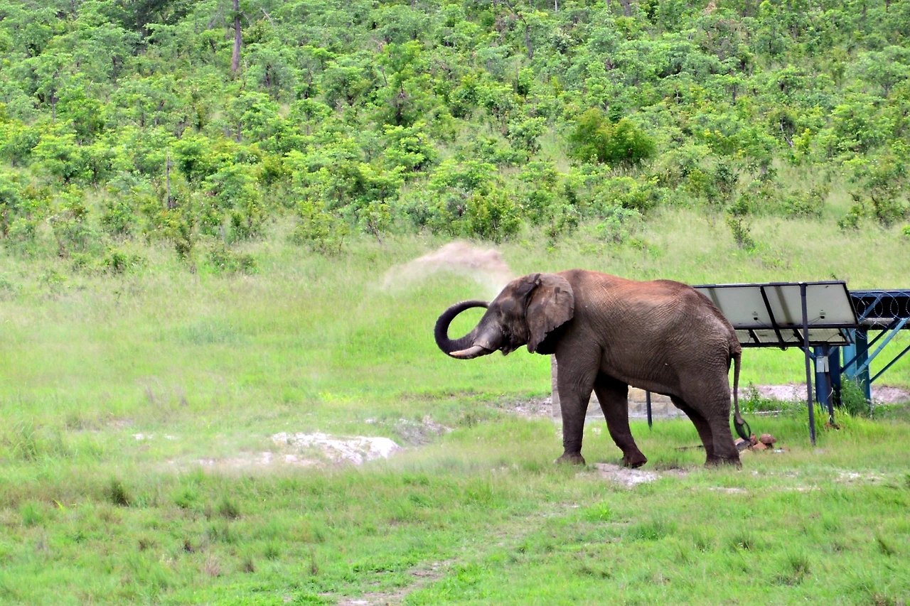 그 녀석들을 뒤로하고 얼마 지나지 않아 진짜 연기자를 만났다. 이 녀석은 앞선 녀석보다 더 쇼맨십이 있어 보였다. 국립공원에서 동물들을 위해 인공적으로 만들어 놓은 연못과 시설물들 옆에 있다가 우리가 녀석을 발견하자 성큼성큼 연못으로 다가가더니 코로 물을 움켜 마시기 시작했다. 아니! 마시는 게 아니었다. 코로 물을 뿜어 샤워(?)를 하는 것이었다. 일행들의 탄성과 함께 셔터 소리가 바쁘게 이어졌다. 녀석도 신이 났는지 이번에는 조금 앞으로 가더니 쌓아둔 모래를 집어 들고 모래 샤워까지 하는 것이었다. 기특하기도 하여라. 지구 반대편 한국이라는 나라, 코끼리는 자생하지도 않아 동물원에나 가서야 볼 수 있는 그런 나라에서 온 우리를 위해 완벽한 쇼를 보여주는 기특한 녀석~!