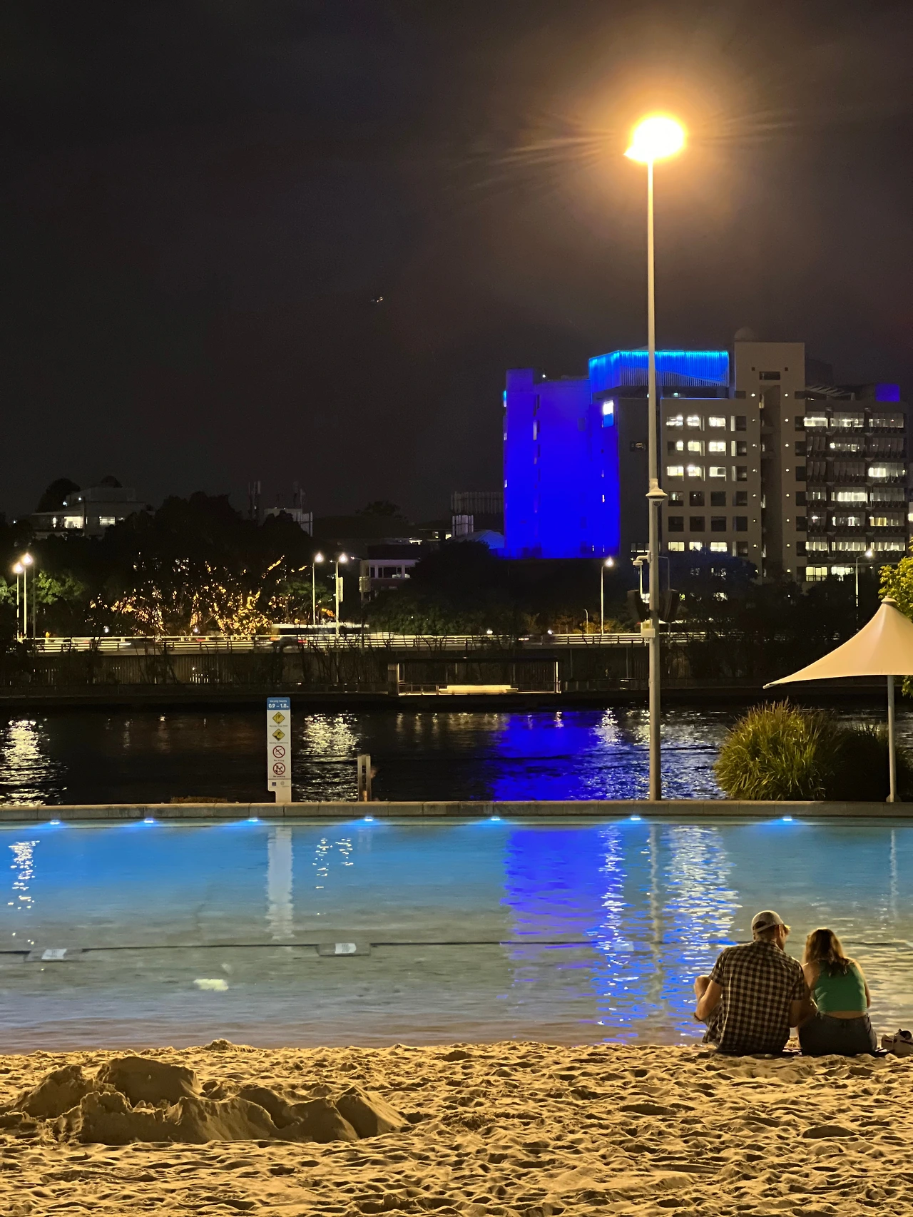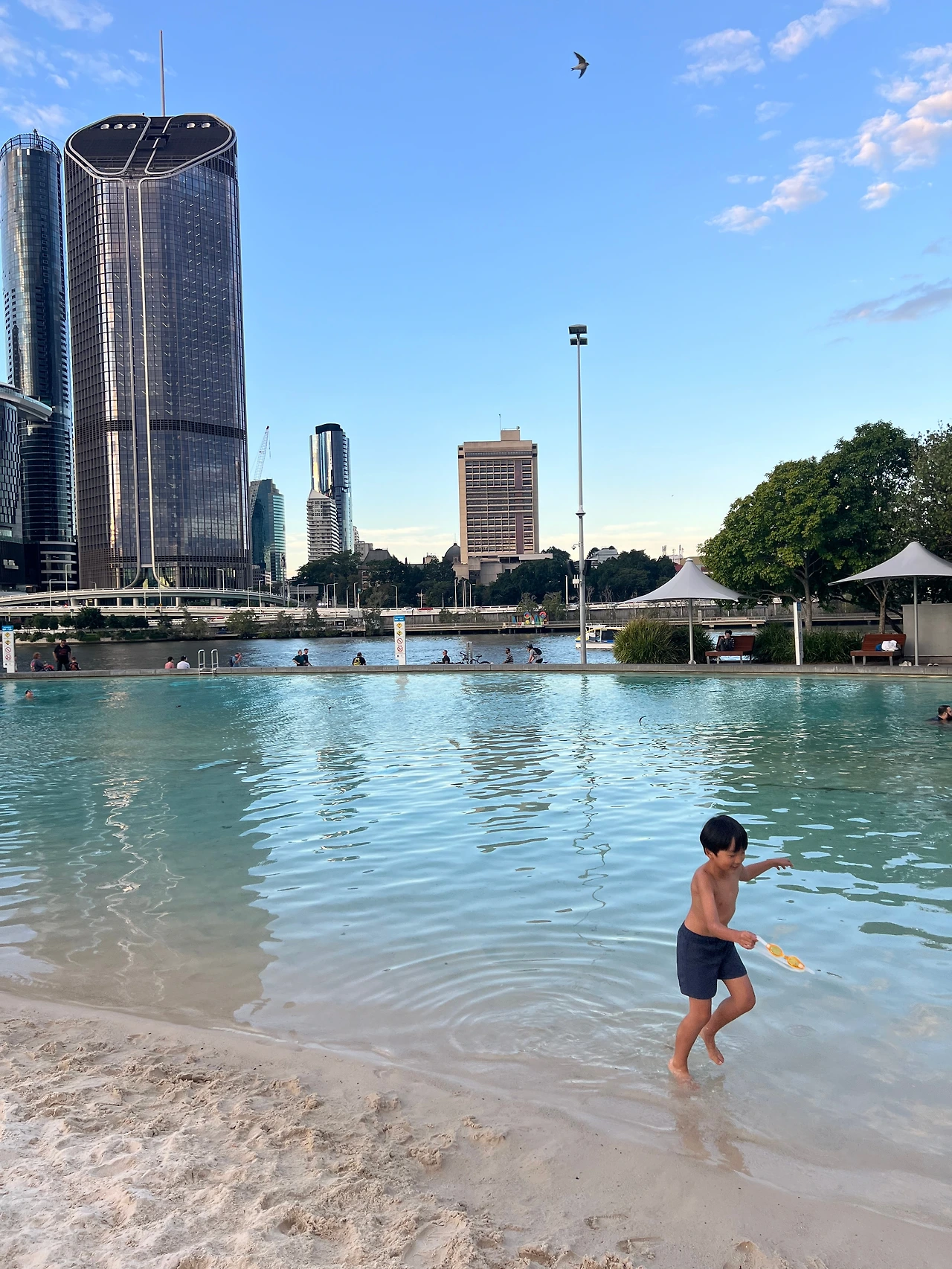 도시 중심으로 돌아온 우리는 사우스뱅크 지역의 상징인 스트리트 비치(인공 해변)로 향했다. 여행가이드에서 도시를 대표하는 스팟으로 이곳 비치를 소개할 정도로 브리즈번 여행의 핵심과 같은 곳이다. 조금 서늘한 날씨 탓에 미루다가 마지막 날에 드디어 가게 되었다. 물을 좋아하는 이은이의 적극적인 구애도 한몫했다. 구글 지도에는 오후 5시에 닫는다 정보가 있어 서둘렀는데 도착하고 보니 다행히 제한시간은 없었다. 저녁이 되자 조금 더 쌀쌀해진 탓에 물도 꽤 차갑게 느껴졌지만 아이는 아랑곳하지 않고 수영복으로 갈아입고 물에 뛰어들었다. 보통 도시 강변에 수영장을 만들 법하지만 모래를 가져와 진짜 해변처럼 만들어놓은 아이디어에 감탄할 수밖에 없었다. 게다가 누구나 무료로 이용할 수 있는 점에서 이 도시의 여유가 물씬 묻어났다.