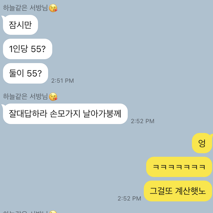 남편한테 내 계좌로 먼저 이체해달라고 메시지를 쓰다 슬쩍 금액을 올렸다. 55불로.