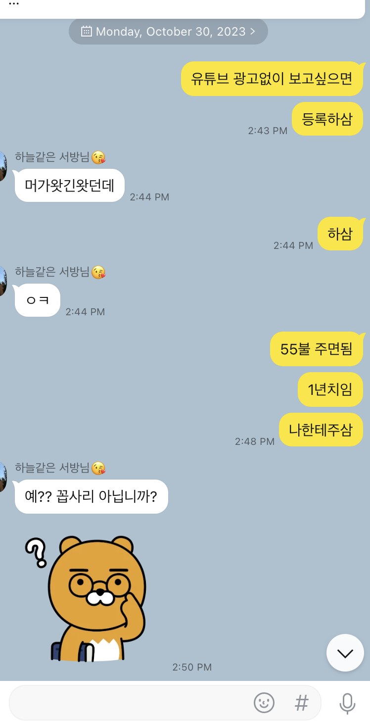 넷플릭스 가족 패키지처럼 그냥 껴주는 건 줄 날았나보다. 꼽사리는 무슨. 비싸서 그렇게 안되니까 얼른 55불 보내라고 독촉했다.