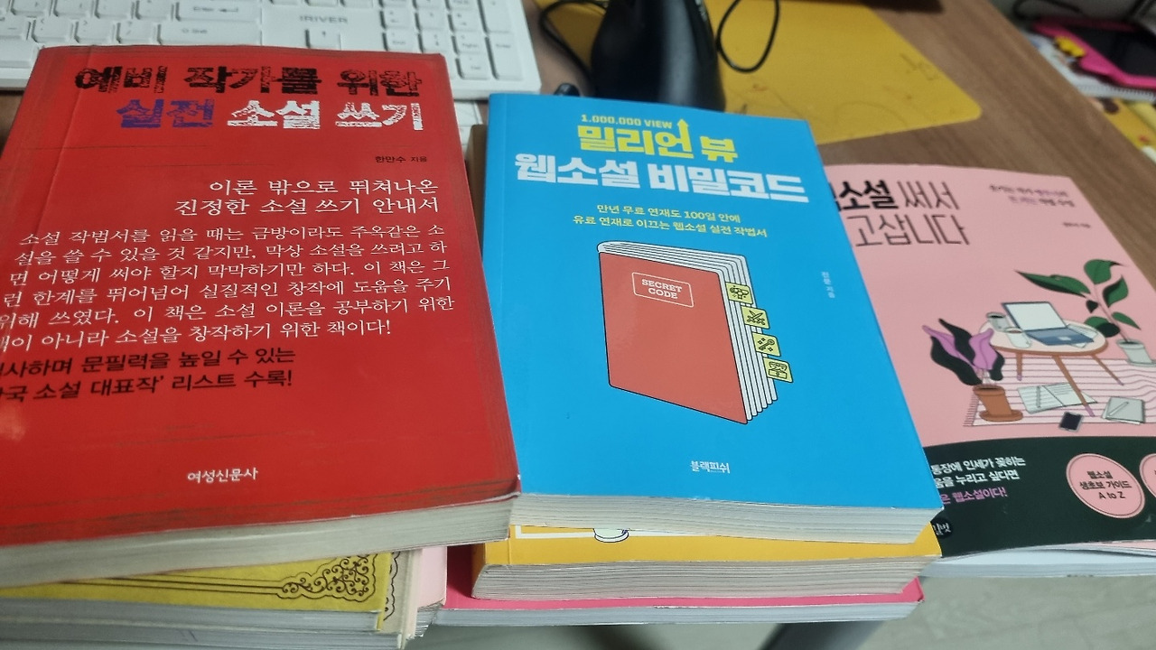 한 권 읽다 모르겠어서 두권읽고, 두권읽으니 더 모르겠다는 생각에 세 권을 읽게 되고ㅇ, 그러다 스무 권 가까이 되는 작법서와 웹소설 작가들이 쓴 책을 사게 되면서 유료 강의까지 결제하며 반년이 지나가도록 웹소설 한 편 제대로 써 보지 못한 채 6개월이 흘러버렸다.