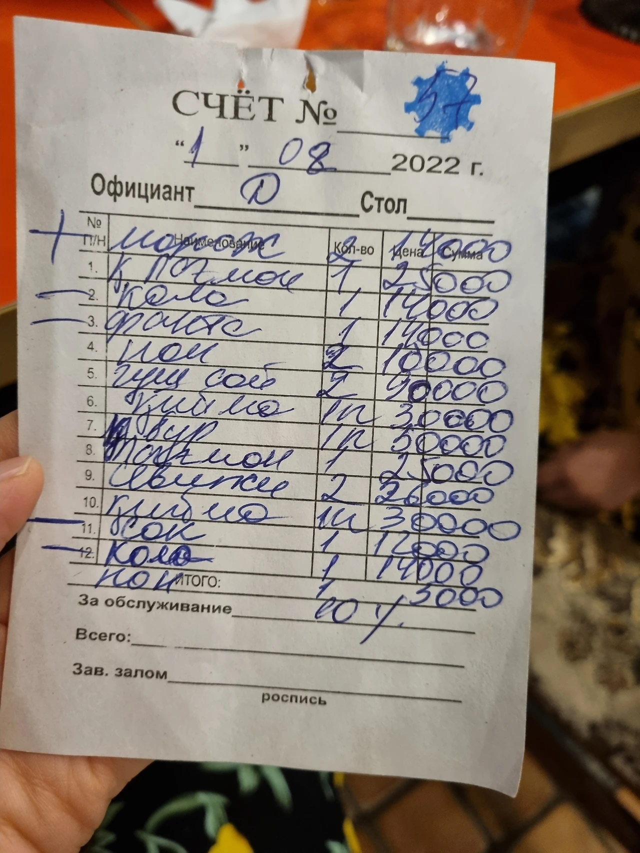 무조건 손으로 작성하는 빌지.동그라미가 많아 보이지만 4만원이 채 되지 않았다.