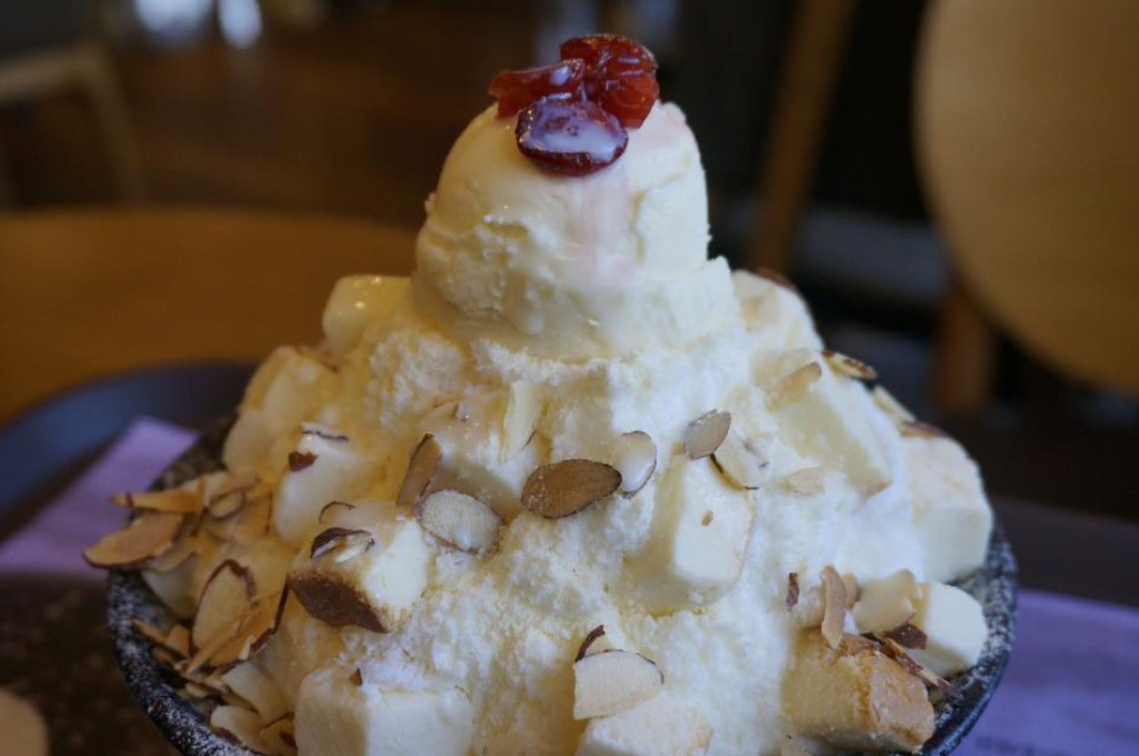 배달 문화가 발달이 안된 이곳에서 어플로 빙수 한 그릇 주문하여 집에서 편하게 앉아 빙수를 먹는 모습.