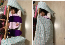 끈으로 단단히 침대에 묶어 안전하였고 엄마의 손이 좀 더 자유로워질 수 있어서 남편과 부족을 도와 일을 할 수 있다는 장점이 있었다