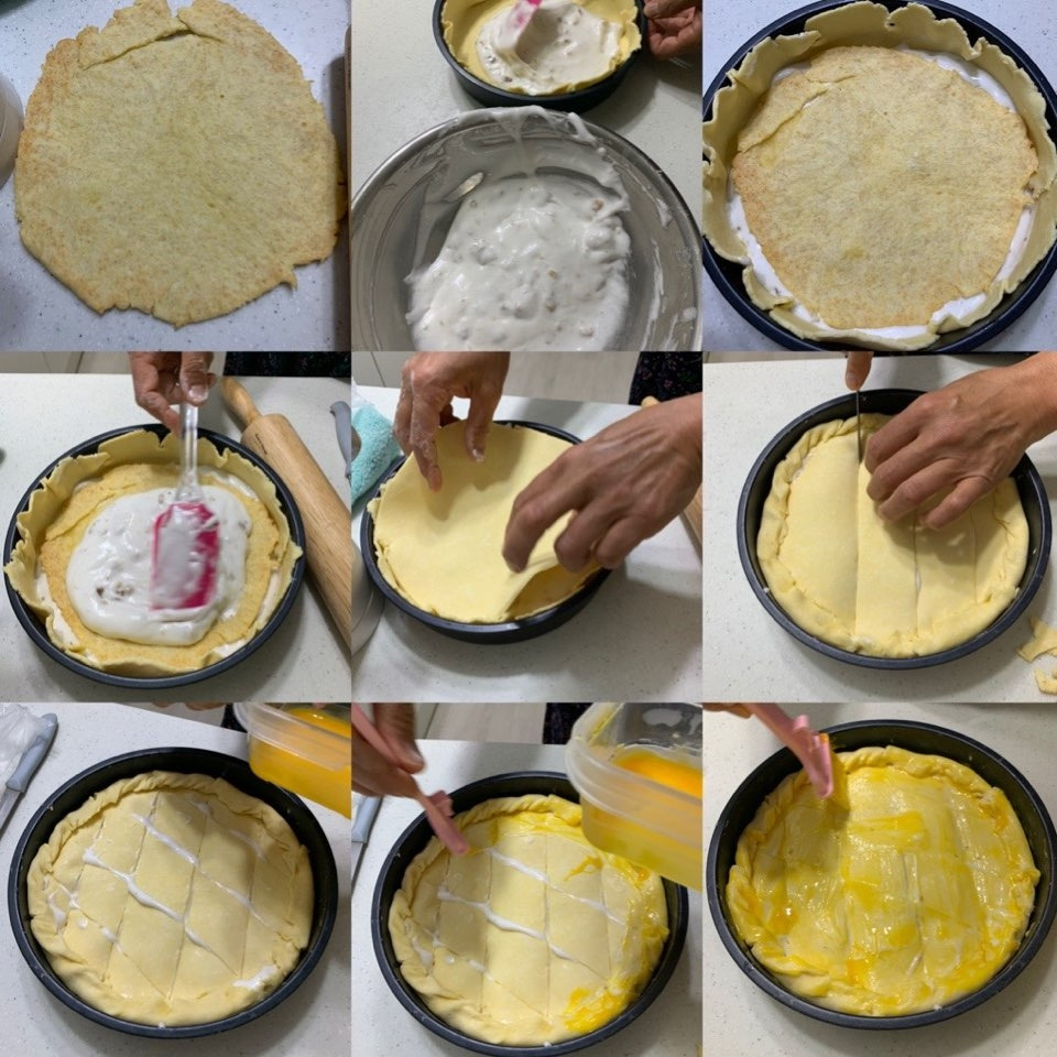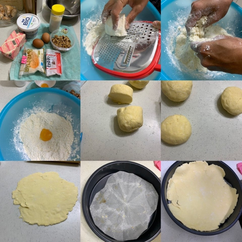3. 2개는 비닐랩에 씌어 냉장고에 잠시 넣어놓고 하나는 밀가루를 바닥에 살짝 뿌려 밀대로 밀어 오븐 그릇에 종이를 깔고 넣어 예열시킨 오븐에 넣고 10분간 굽는다