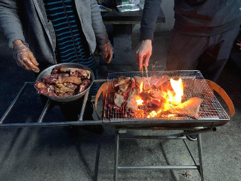 불이 숯에 잘 붙어서 고기를 걸어 굽기 시작했다