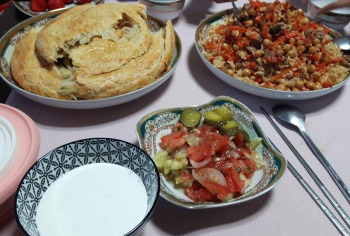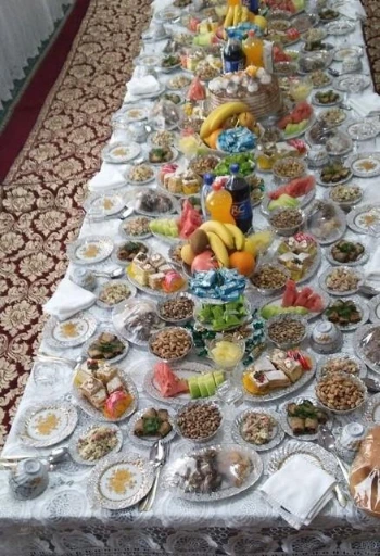 (우즈베크는 음식을 먹을 때 순서가 있다 상 위에는 주식인 넌(빵)과 요리된 음식부터 과일 그리고 초콜릿 견과류 케이크 등 올려져 있고 가벼운 음식부터 메인 음식을 먹은 후 견과류와 과일 디저트를 먹으며 차를 마신다 단순히 식사만 한다는 개념이 아니고 가족과 침목도 다지고 지인과의 안부도 묻고 하기에 식사시간이 꽤 길다