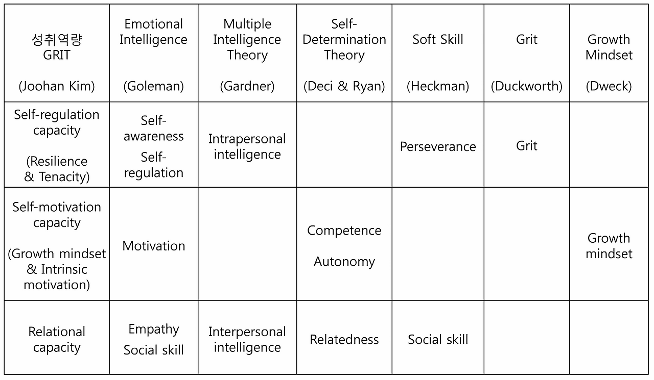 대표적인 비인지능력에 관한 이론들이 강조하는 핵심 개념들을 정리해보면 다음 표에서 보는 바와 같이 모두 세가지 마음 근력 중 하나에 해당함을 알수 있다.