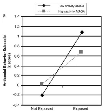 MAO-A 유전자 변형은 어린 시절에 학대나 트라우마를 겪은 경우에 한해서 성인이 되었을 때 공격성향과 반사회적 행동을 유발한다는 연구 결과는 지속적으로 보고되고 있다 (Checknita et al., 2020; Frazzetto et al., 2007). MAO-A 유전자 (정확하게 말하면 촉진유전자 MAOA promoter)의 변형의 효과를 어린 시절의 학대와 트라우마 경험과 관련지어서 살펴본 27개의 연구에 대한 메타 분석 결과에 따르면 이러한 경향은 특히 남성에게서 강하게 나타났다. 아마도 MAO-A 유전자가 X염색체 위에 존재하기 때문일 것이다. 여성은 MAO-A 유전자의 변형의 효과가 어린 시절의 학대와 별다른 상호작용 효과를 보이지 않았다. 다만 학대 받았다는 사실 자체가 반사회적 행동을 약하게나마 예측했다(Byrd & Manuck, 2014). 즉 여성에게 있어서 공격성향과 반사회적 행동을 유발시키는 것은 MAO-A 유전자의 결함 여부보다 어린 시절의 학대라는 환경적 요인이 더 크다는 뜻이다. 유전자가 인간의 행동에 영향을 미치는 방식은 이처럼 복잡하다.