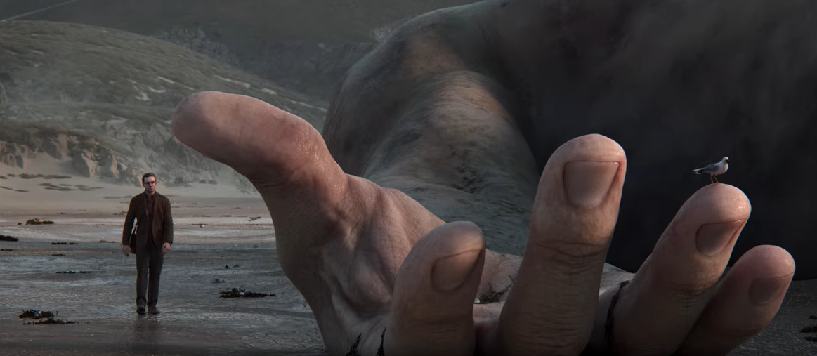 다시 영화로 돌아오자면, 이 작품은 독특하게도 살아있는 대상을 통해 ‘생명과 존재’에 대한 물음을 던지는 대신, 이미 생명을 잃은 존재를 통해 물음을 던진다. 영화 속 인물들은 거인을 그저 하나의 존재(being) 혹은 소유물로 바라볼 뿐이다. 그들은 괴생물을 봤을 때 느낄 가장 기본적인 감정인 ‘공포심’ 마저도 보여주지 않는다. 심지어는, 그나마 거인에게 진심 어린 관심을 보이던 스티븐 조차도 거인이 누구인지, 어디서 왔는지, 왜, 어떻게 이곳으로 오게 되었는지는 궁금해하지 않는다. 그의 관찰 속에는 거인의 시체가 인간의 형태를 잃어가는 과정만이 담겨 있다. 그러면서도 스티븐은 하나의 소유물로 여겨지는 거인에게 안타까움과 동정심을 느끼며,