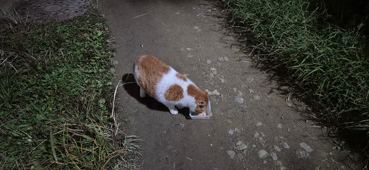 저녁 산책을 나가면 이렇게 만나는 경우도 많아서 츄르를 주는 편인데 넉살이 좋은 녀석이라 많은 사람들한테 사랑을 받고 있지.