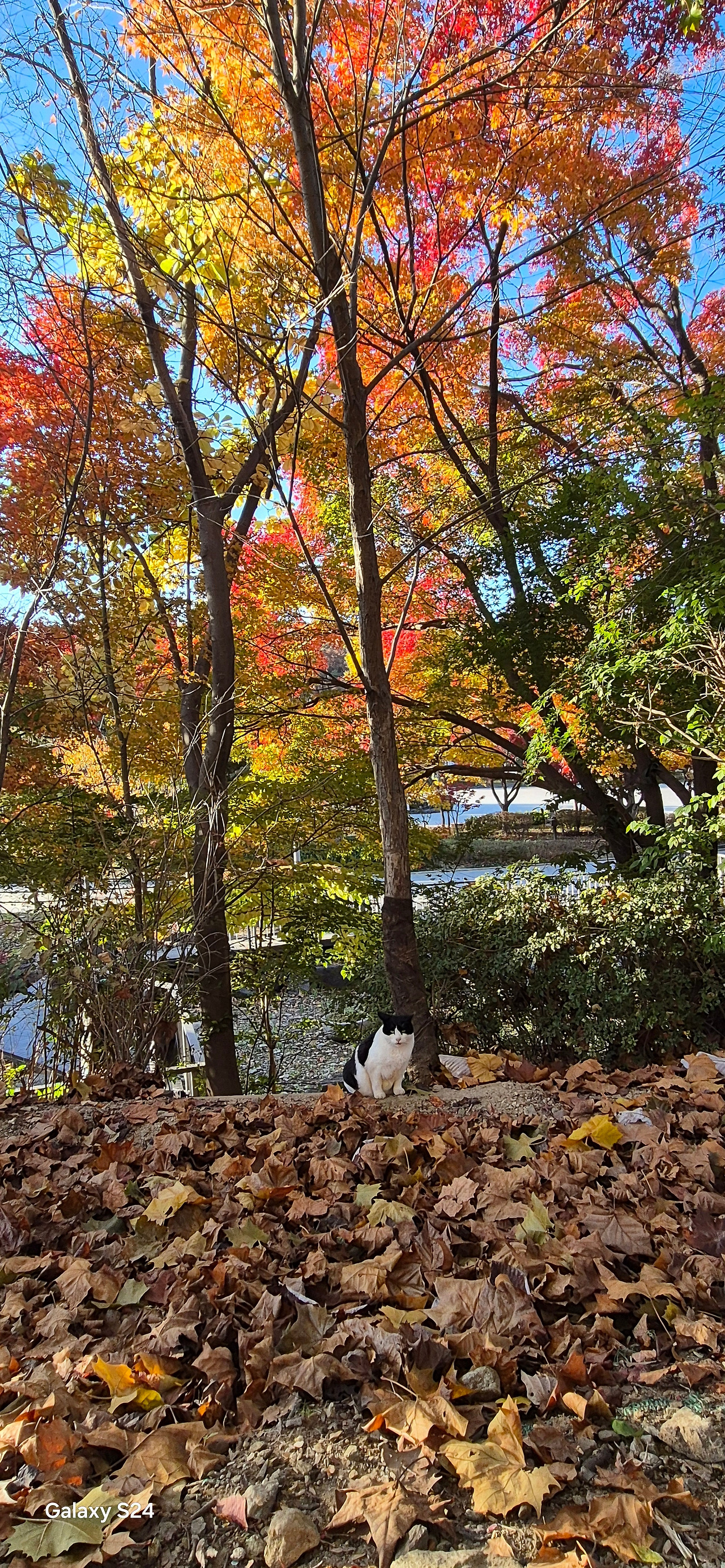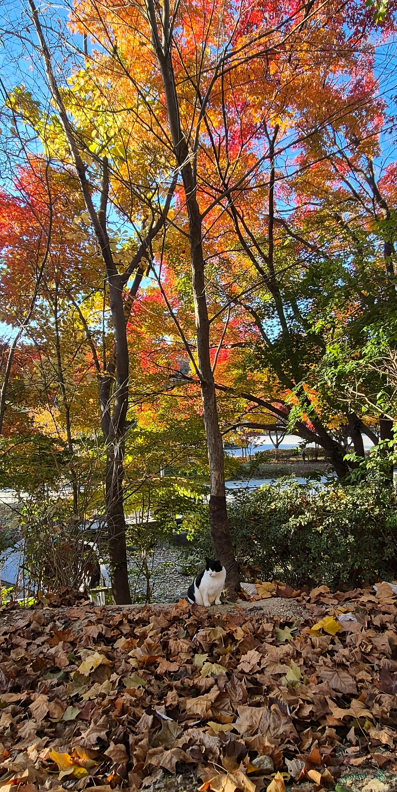 내가 다른 곳을 산책하고 온 사이에 저렇게 알록달록 가을색으로 물들어가는 나무 아래에 있는 장군이를 보게 되었어.
