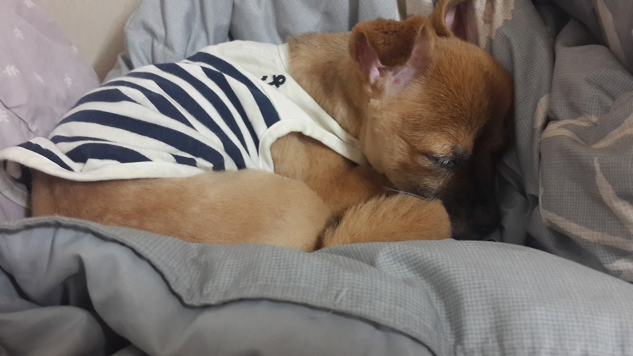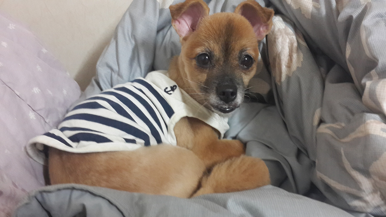 동물 병원에서 애견 미용을 하고 나서 박박 털이 밀린 꼬맹이 너의 몸이 보기 안쓰러워서 옷을 입혔더니