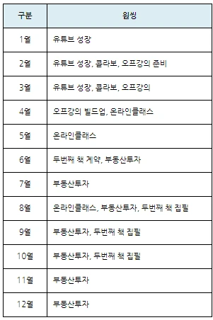 특히 온라인클래스의 성패가 관건일 것으로 보이며 이중 유튜브, 유튜브 강의, 글로벌셀러는 목표치가 높지 않아 충분히 가능할 것으로 본다. 무난한 목표 달성을 위해 첫번째 책의 어시스트가 중요할 것으로 보고 있다. 베스트셀러가 되면 강의 쪽은 아주 스무스하게 흘러갈테니까 말이다.