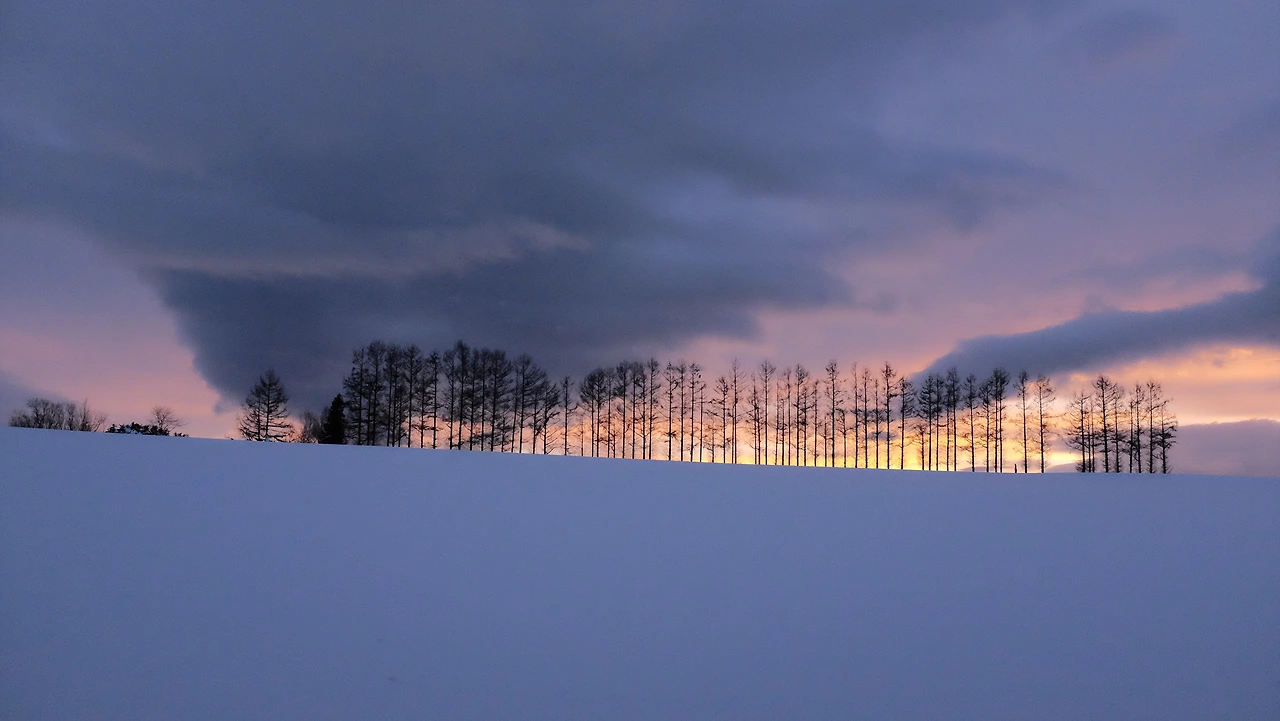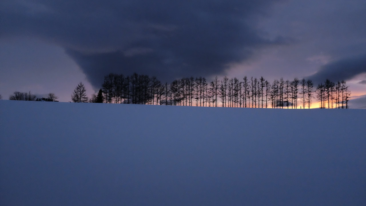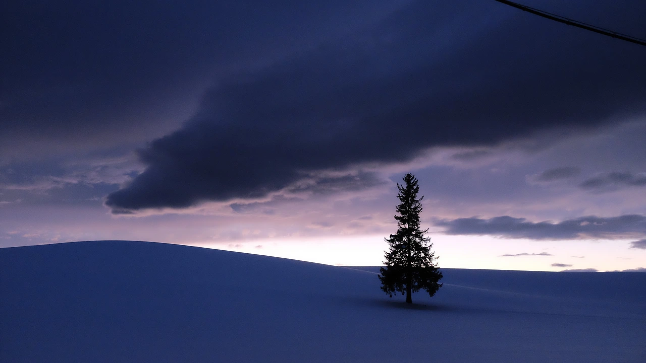 비에이 나무 투어의 하이라이트는 크리스마스트리 나무였다. 인스타그램 검색창에 비에이라고 치면 항상 먼저 나오는 장소이다. 사실 비에이 여행의 시작이 바로 이 나무 사진 한 장으로 시작되었기 때문에 기대가 컸다. 도착할 무렵 이미 일몰이 끝나가고 있어 못 보면 어떻게 하나 걱정을 했지만, 걱정과 달리 더 아름다운 풍경을 보았다. 낮은 언덕에 비친 어둠은 자연스러운 그라데이션이 표현됐고, 하늘은 구름이 살짝 걷혀 훗카이도 여름 들판의 라벤더색이 나타났다.