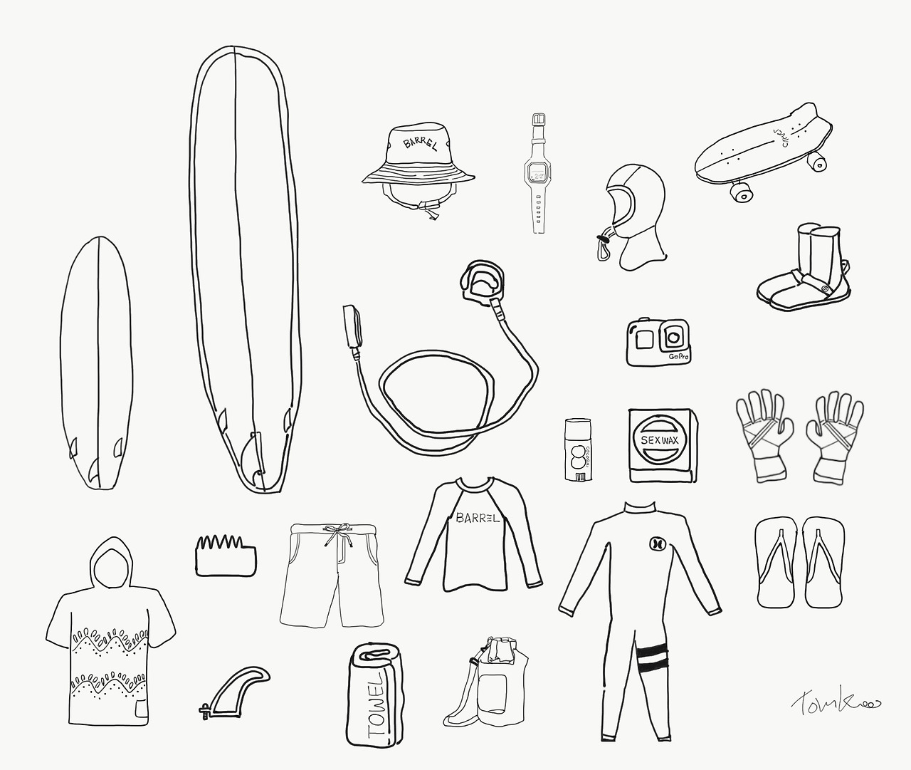 숏 보드, 롱보드, 서핑 모자, 시계, 네오프렌 후드, 카버 보드, 부츠, 고프로, 리쉬, 코코 선크림, SEX WAX, 네오프렌 글로브, 쪼리, 슈트, 래시가드, 드라이백, Towel, Fin, 왁스 빗, 판초 타월. 사도 사도 끝이 없네요.