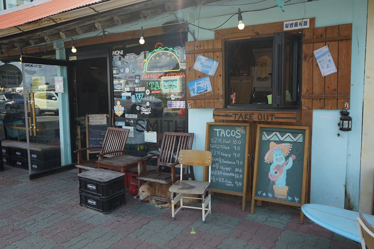 죽도해변에 있는 대표 음식점 파머스 키친(Farmer's kitchen). 원래는 수제 햄버거집이었으나 근처 2호점으로 이사하고 1호점 이곳에서는 타코를 팔고 있다. 죽도해변으로 서핑 왔으면 한 번쯤은 들리는 랜드마크와 같은 곳. 사진을 찍거나 혹은 먹으러 오던가. 파머스 키친 앞에 앉아 먹을 때는 주의하자. 사장님이 키우는 개가 개 아련한(?) 눈빛을 보내면 먹고 있던 타코를 안 줄 수 없으니 말이다.