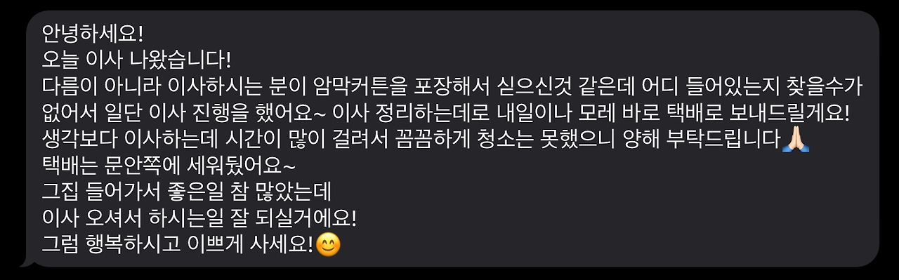 가벼운 마음으로 다시 집에 돌아왔을 때쯤 전 세입자로부터 문자가 왔다. 집을 보러 왔을 때부터 중간중간 작은 문의사항이 생길 때 연락을 드렸었는데 항상 친절하게 대답해주셨던 분이셨다.