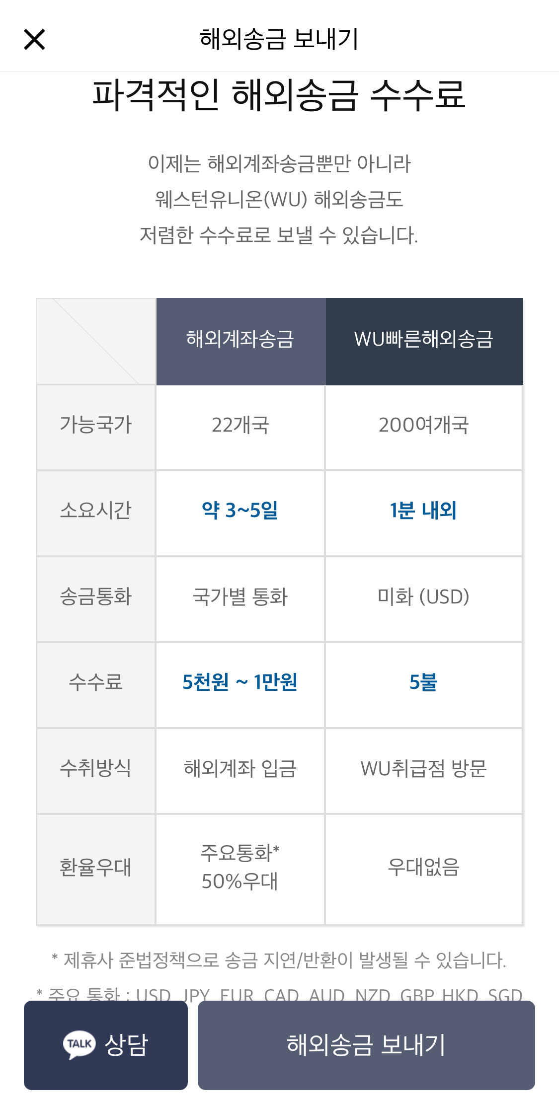 내가 사용하는 인터넷은행에서는 아래와 같이 2가지 해외송금 방식을 제공한다. 아직까지는 급할 일 없기에 일반 해외계좌송금을 하고 있다. 수수료가 최대 1만 원이어서 이번에 가장 큰 목돈을 보내보았을 때도 수수료가 1만 원이었다. 환율이 좋은 상태였고, 주요 통화로서 AUD를 우대해주어서 50% 우대도 받았다.