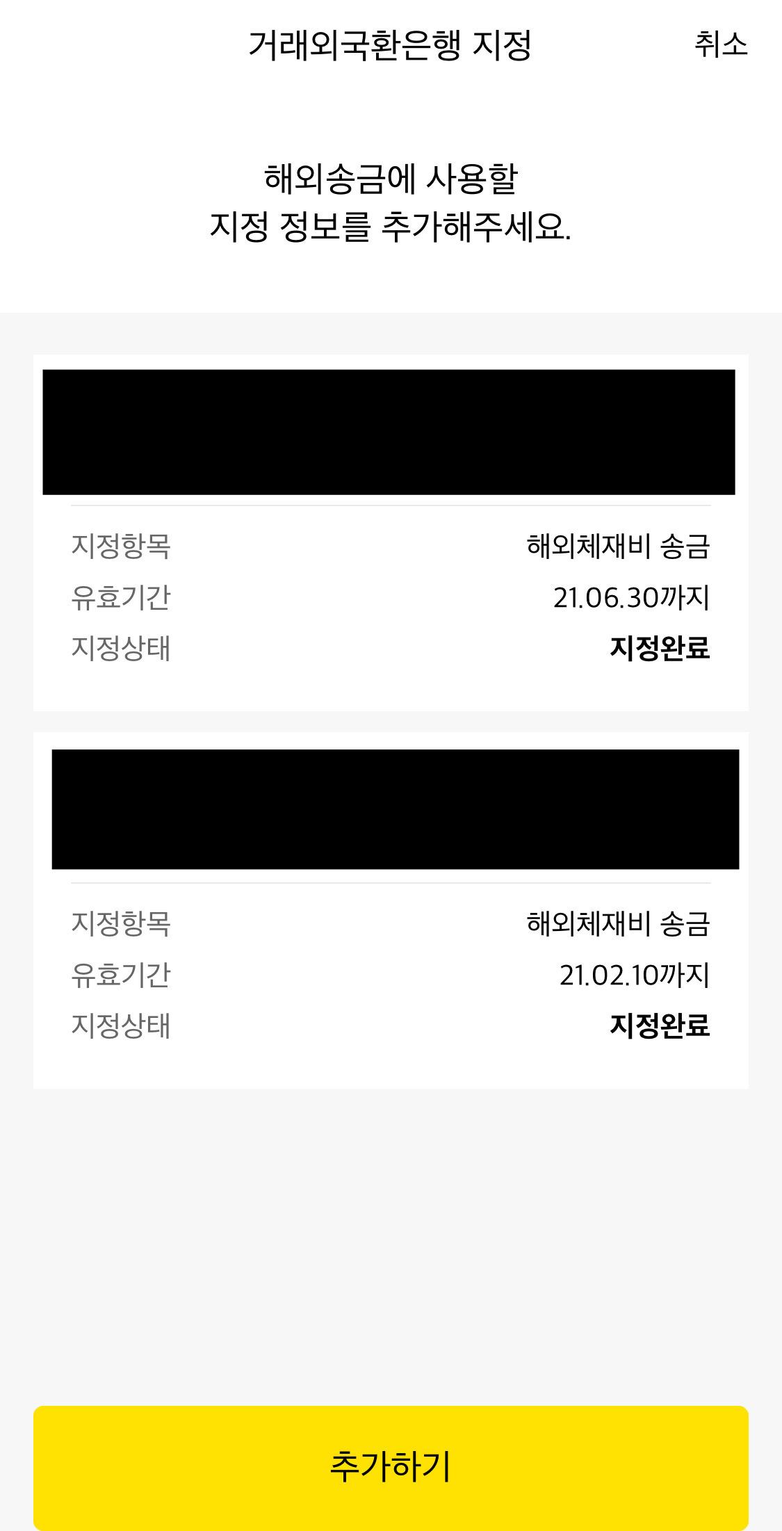 해외 송금은 요즘 워낙 간편하고 편리해서 다들 잘 알고 있을 것이다. 일회성 비용이 아닌 우리는 아래와 같이 ‘거래외국환은행 지정’을 해두고 있다. 우리 집 두 유학생이 각각 자격이 되므로 (=학비를 열심히 내고 있음) 각각 등록 시점에 ‘해외체재비 송금’ 항목으로 지정해 두었다.