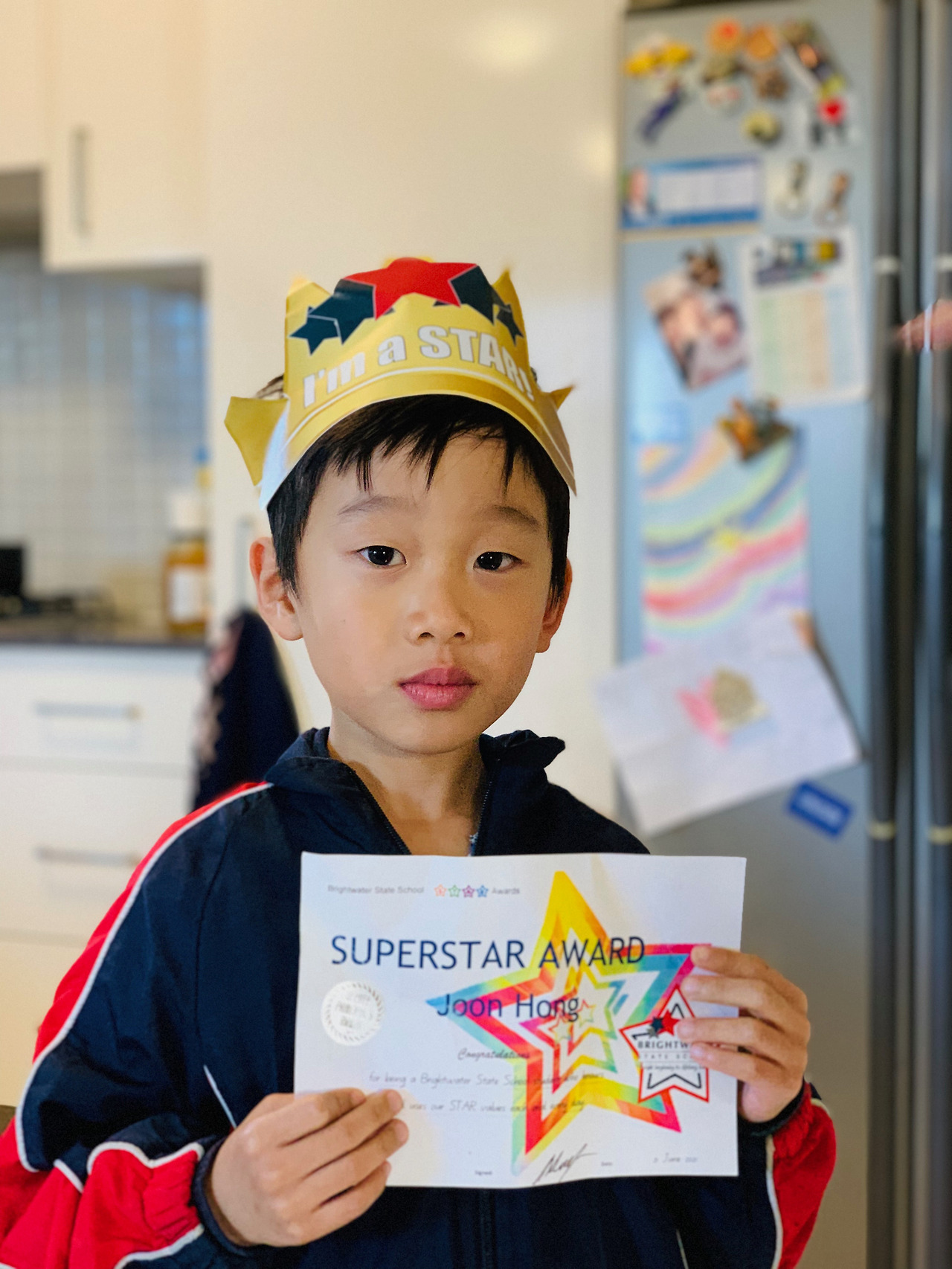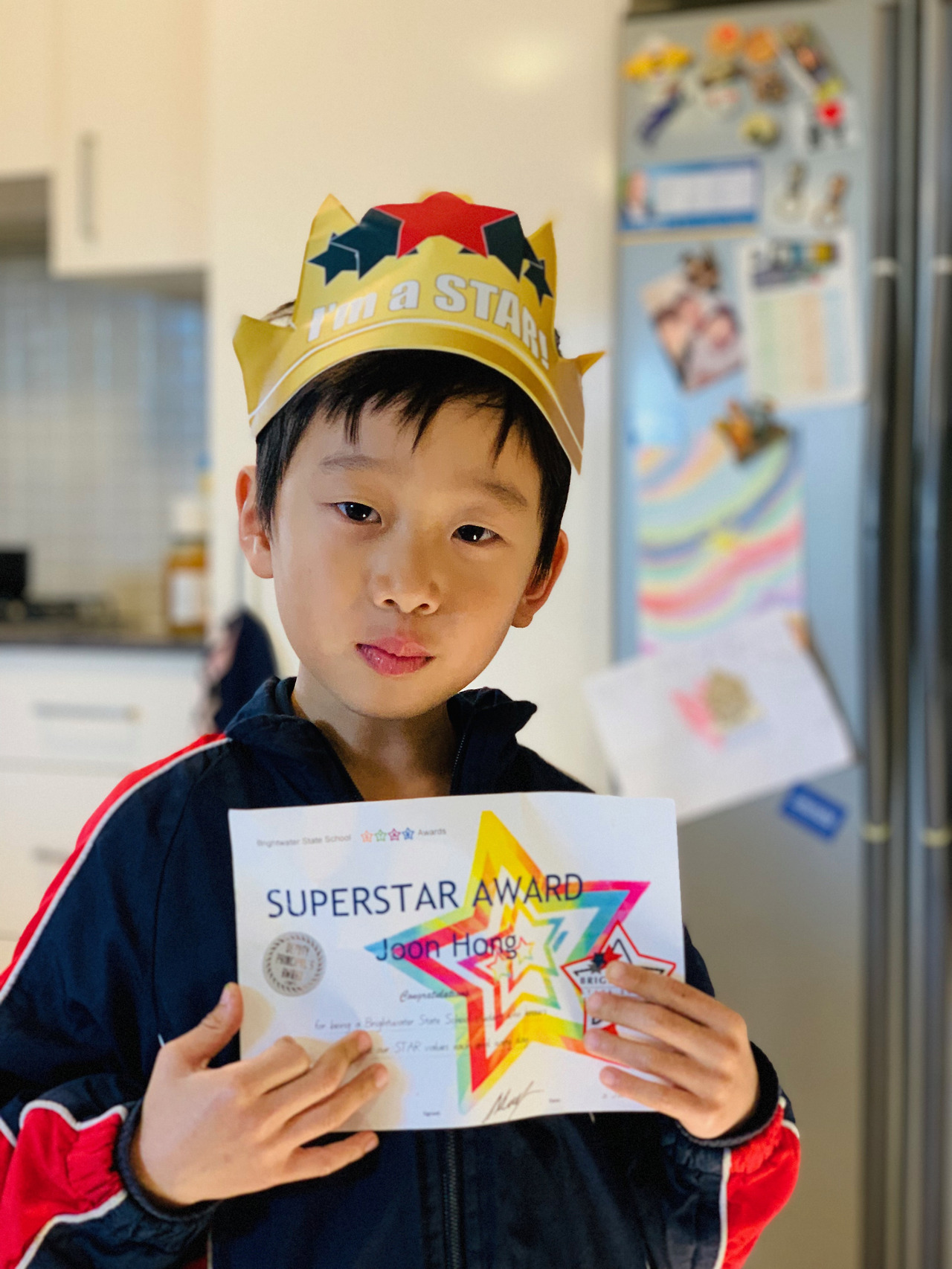 드디어 행사가 있는 월요일 아침 D day! 아들은 아침부터 두근두근하고 떨려했다. 우리는 가서 맛있는 거 많이 먹고 오라고 기운을 북돋아 주었다. 그날 하교 후 후기를 들어보니 정말 아들다웠다. 열심히 말씀하셨던 교장 선생님 말씀은 하나도 기억을 못 했다. 눈앞에 있는 선물 꾸러미를 보고는 너무 커서 가방에 어떻게 넣을지 고민만 했다고. 하하. 그러느라 주어진 간식도 못 먹고 결국 끝나고 나서 주섬주섬 제 몫을 챙겨서 왔다고. 아침에 왁스로 머리 스타일링을 해주었는데 그게 아무 소용이 없었단다. Star Student 왕관을 써야 해서 의미가 없었다고. 그날 아들 얼굴에는 스스로 자랑스럽고 행복한 하루를 보내고 온 미소가 떠나지 않았다.