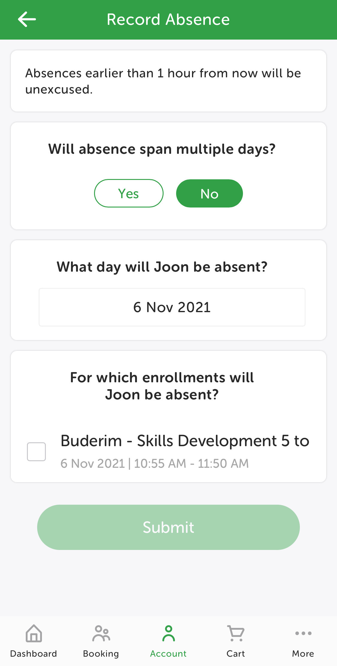 - 결석 및 보충수업 : 결석이 예상되면 미리 등록해서 보충 수업을 위한 메이크업 토큰을 받을 수 있다. 이 토큰은 60일 내에 사용해야 한다.