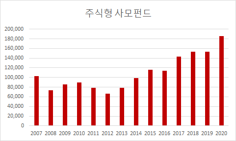 물론 사모펀드 시장은 커지고 있습니다. 같은 기간 주식형 사모펀드는 2배 가까이 성장하여 8~9조이던 것이 현재는 18조로 두배 가량 증가했습니다.