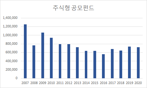 하지만 주식형 사모펀드 규모 자체가 상대적으로 작다 보니, 2배가량 성장해도 공모펀드에서 빠져나간 금액을 다 메우기에는 역부족이었습니다. 결국 주식형 펀드 소계 기준으로도 2007년 135조 수준에서 2020년 90조로 하락하는 모습을 보였습니다. 자산운용사의 주 수입원이던 주식형 공모펀드가 줄어들면서 당연히 운용사의 포트폴리오도 대체투자나 ETF 등으로 재편되었고 많은 펀드매니저, 애널리스트들도 주식형 펀드 시장을 떠났습니다.