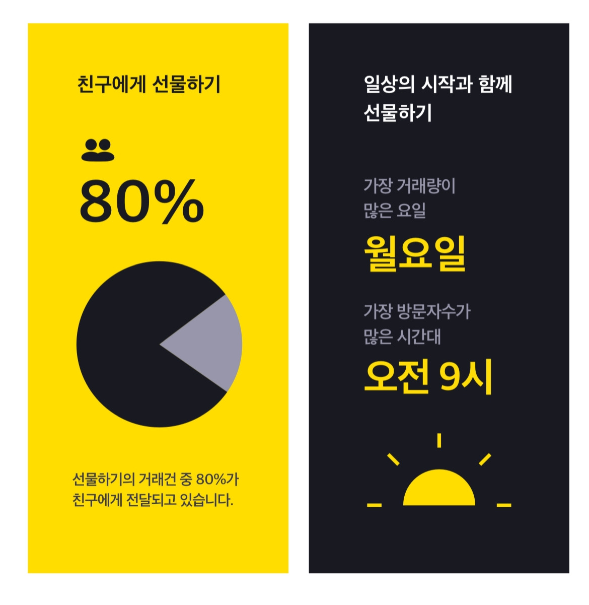5조 원이 넘는 거래액이나 카카오톡이 갖고 있는 막강한 활성사용자 등 강점을 차치하고라도, 선물하기 플랫폼에는 주목할만한 여러 특징이 있어 정리해 봤다.