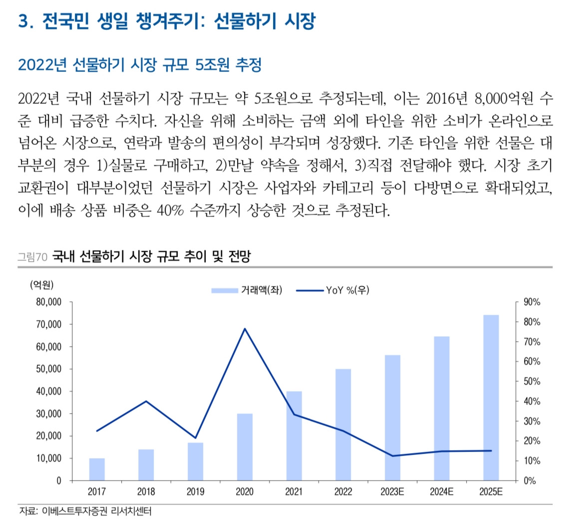 크다면 크고 아직 작다면 작겠지만, 선물하기는 그 성장세가 상당하고 브랜드들에게 선물하기는 매출 볼륨을 넘어 브랜딩, 바이럴 등 다양한 부가가치 창출이 가능한 플랫폼이다.