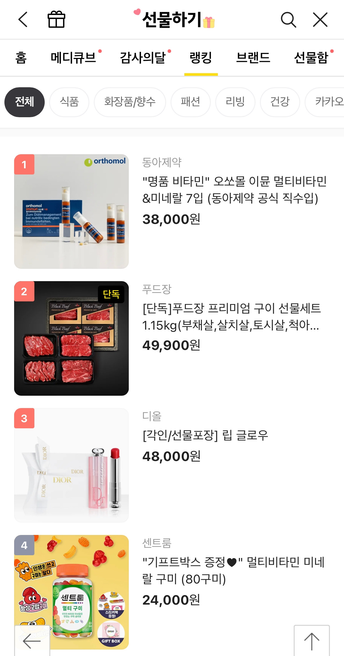 1번과 비교하면 모순적인 이야기다. 일반 커머스도 그렇지만 선물하기는 더욱 가격대에 예민하다. 고객이 주변에 선물을 전달할 때는 각자만의 가격대 기준이 있다. 예컨대 우리가 평소에 쓰던 상품은 가격이 올라도 저항이 덜하지만 선물 상품은 가격이 오르면 곧바로 다른 선택지로 옮겨간다. 구매할 상품을 정하고 사는 게 아니라 가격대에 맞는 상품을 찾기 때문이다. 살 상품이 정해져 있는 일반 구매패턴과는 다르다.
