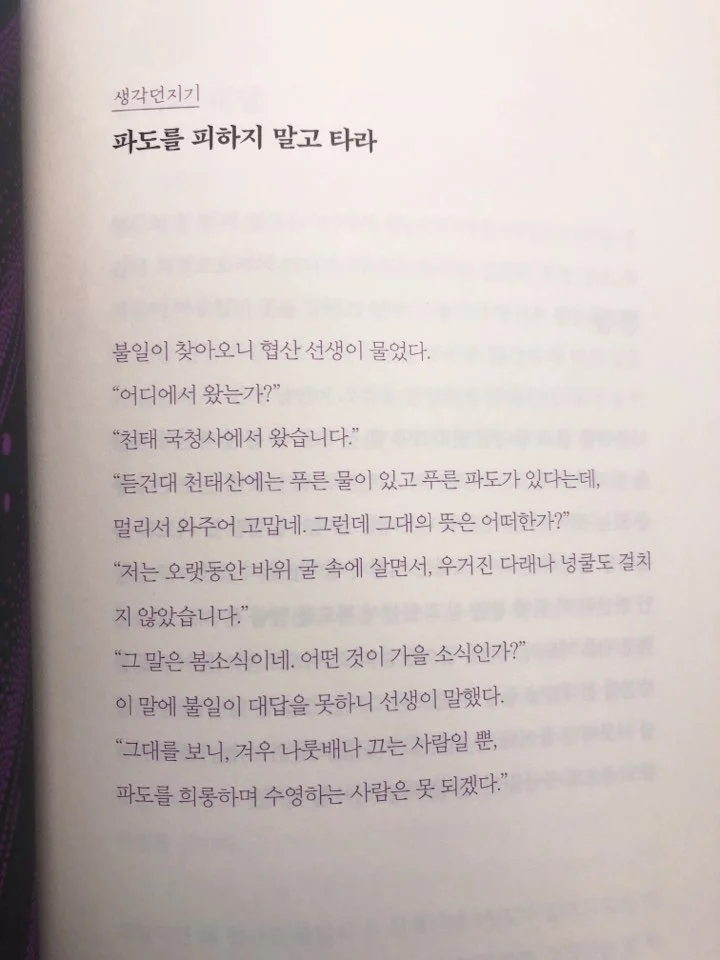 도대체 왜 협산 선생은 파도라는 말로 불일을 괴롭힌 걸까? 산에 파도가 있다는 말은 그저 시적인 표현인 걸까? 아니면 모순적 표현을 이용해 어떤 위대한 철학을 알린 셈일까? 협산 선생은 마지막 행에 가서야 '파도'의 뜻을 말한다. 이 대화에서 파도는 '희롱의 대상', 즉 놀이의 대상인 것이다. 대학교 첫 학기 교양 수업에서 교수님이 하신 말씀이 생각 났다. "놀아라. 대학 입시 치르느라 고생 많았다. 놀아라." 그런데 지금 이 글을 읽으면서 다시 생각해보니, 그 '놀아라'라는 말이 이렇게도 들린다. "공부를 했으면, 그 내용을 가지고도 놀 수 있는 사람이 되어라." 아마 나는 이것이 협산 선생이 불일에게 모진 방식으로 가르치려 한 내용이 아닐까 싶다. 글을 쓰고, 토론하고, 때로는 깨달은 모든 지식을 무너뜨리며 반대 측면의 지식을 깨달아가는 것, 그것이 공부하는 사람에게만 허용된 또 하나의 '놀이'가 아닐까?