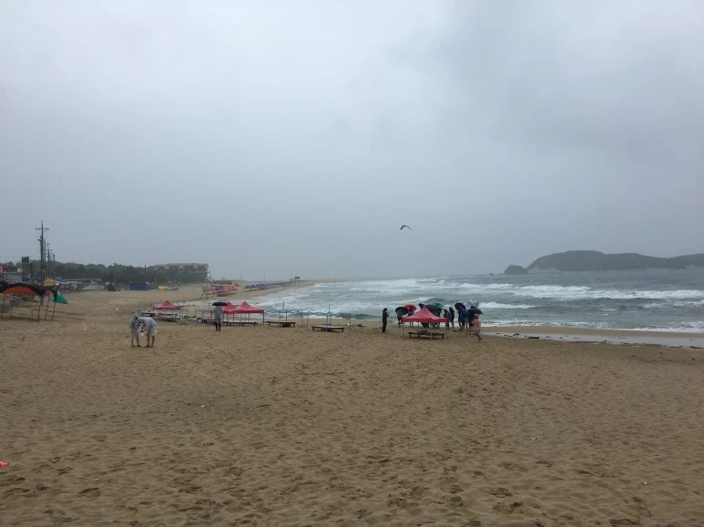 이렇게 파도치는데 사람들은 비 맞으면서 스마트폰만 보고 있고...