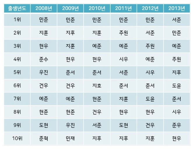 아들의 이름은 이서준(상서 서瑞, 깊을 준濬)이다. "준"자 돌림을 사용해야 한다고 해서 임신 중에 이름을 서준이로 지을까 준서로 지을까 한참을 고민했고 베이비샤워 때까지도 결정을 못하다가 결국 서준이로 결정했는데 그 시대에 가장 인기 있는 이름이 될 줄은 몰랐다. 평생 너무 흔한 이름 "유진"으로 살아온 나는 내 아이들만큼은 조금은 특별한 이름을 지어주고 싶었는데 남편은 너무 특이한 이름에는 강한 거부감을 내비쳤다. 그래서 무난한 이름으로 리스트를 만들었고 그중 선택한 이름이 하필 그 이후부터 가장 인기 많은 이름이 되고 만다. "서준"이란 이름은 그 이후 10년간 인기 있는 남자아이 이름 랭킹 5에 빠지지 않고 등장했다.