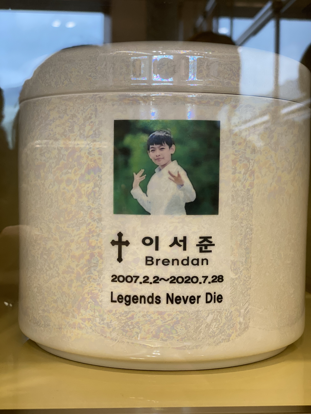 아이의 카카오톡 프로필을 열어보니 "Legends never die"라는 글귀가 적혀있었다. 마치 미리 준비해놓은 것처럼 절묘하게 잘 맞는 이 문구를 그대로 우리 아들 유골함에 새겨주었다. 유골함 대신 방 머리맡에 새겨주었다면 훨씬 더 근사 했겠지만 왠지 아이가 하늘에서 보며 좋아했을 것 같다.