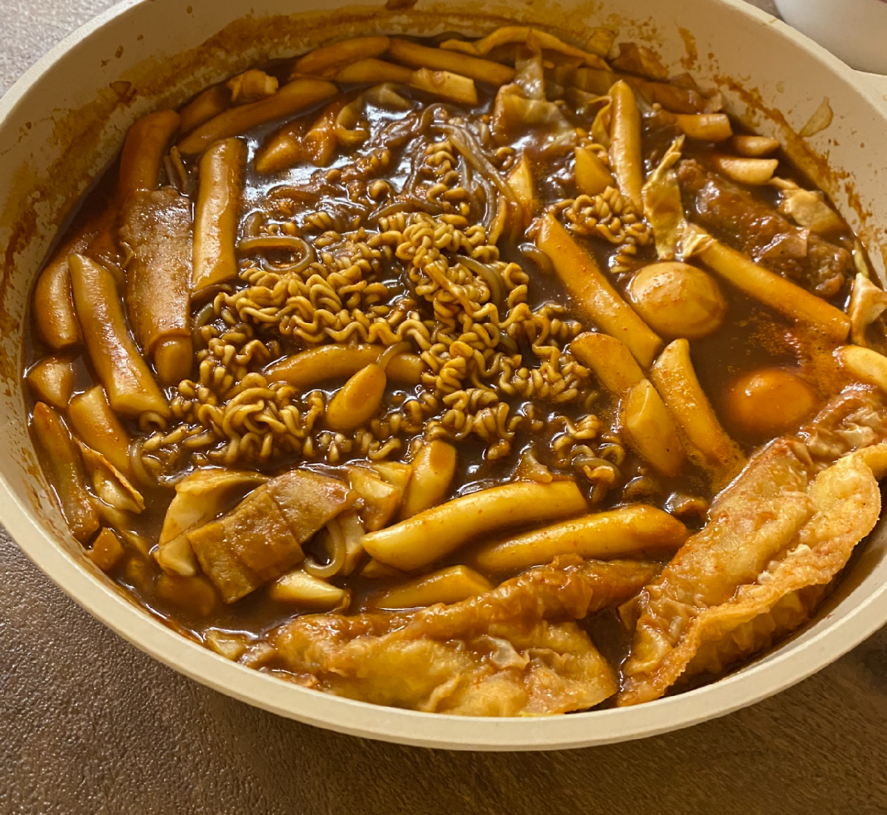 그래서인지 조금 피곤하거나 우울할 때면 자꾸 떡볶이가 당기고 만다. 탄수화물덩어리에 진득한 양념이 몸에 좋을 리도 없는데 끊을 수가 없다. 오늘은 즉석떡볶이사장님께서 특별히 더 챙겨주셔서 3인분이 마치 5인분 같아져 버렸다. 포장을 해와서는 라면사리까지 넣으니 보는 것만으로도 배가 부를 정도로 큰 프라이팬이 가득 찼다.