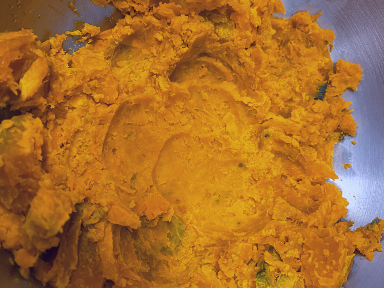 2. 1의 재료를 쿠킹볼에 놓고 호박을 부숩니다. 겉면을 깨끗하게 씻은 경우에는 겉면까지 넣어서 전부 빻으면 되지만, 저는 대충 씻은 탓에 겉은 전부 제거했어요.