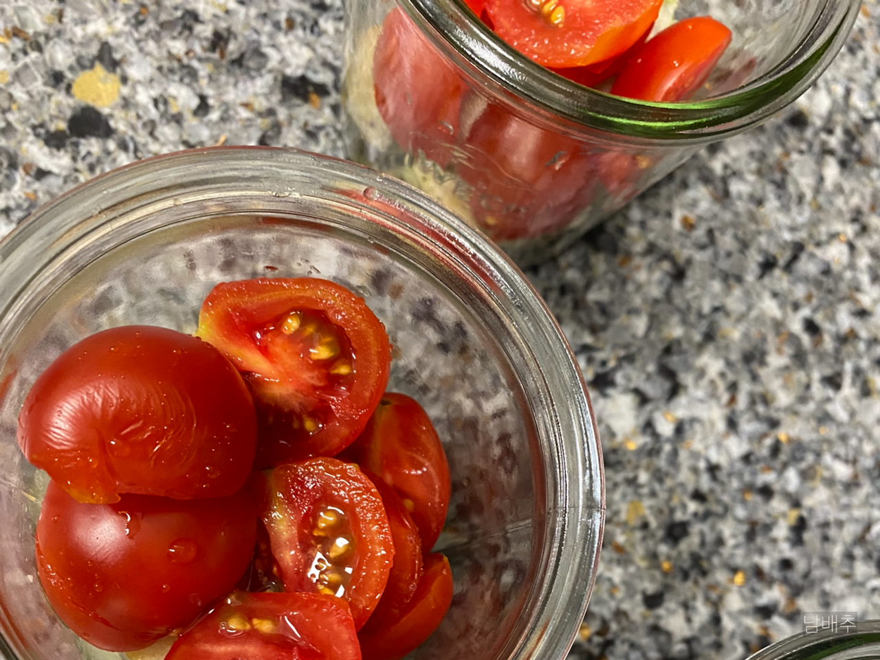 1. 방울토마토는 씻어서 반을 갈라놓고, 루꼴라와 잎채소들은 식초물에 담가 깨끗이 씻어냅니다.