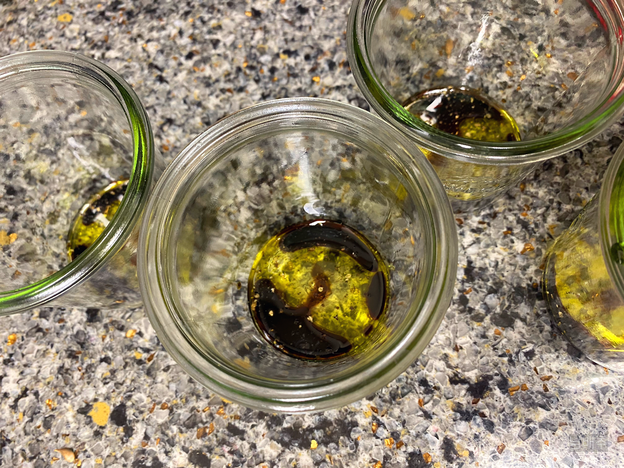 3. 290ml의 웩용기에 먼저 소스를 부어줍니다. 올리브오일 3큰술, 발사믹 1큰술, 레몬즙 1큰술, 소금/후추/오레가노 약간을 넣습니다.